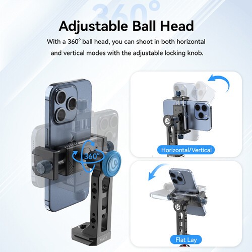 Die Ulanzi MA53 Kugelkopf-Handyhalterung bietet Smartphone-Nutzern professionelle Flexibilität und Stabilität. Diese aus strapazierfähigem Aluminium gefertigte Halterung klemmt Smartphones mit einer Breite zwischen 2,4 und 3,7 Zoll sicher fest und schützt Ihr Gerät dank silikonbeschichteter Klemmen vor Kratzern und unerwünschten Bewegungen.