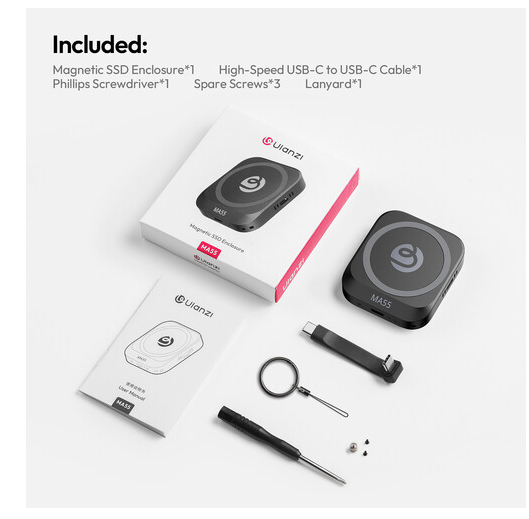Das magnetische SSD-Gehäuse Ulanzi MA55 ist eine vielseitige Hochgeschwindigkeits-Speicherlösung für Profis und Content-Ersteller. Es unterstützt NVMe M.2-SSDs (bis zu 2 TB) und bietet nahtlose Konnektivität mit USB-C 3.2 Gen 2- und USB-C PD 3.0-Anschlüssen. Mit Unterstützung für 4K-ProRes-Videoaufnahmen, einem integrierten Lüfter und einer magnetischen Befestigung für eine einfache Einrichtung eignet sich dieses Gehäuse perfekt für mobile Aufnahmen und schnelle Datenübertragungen.