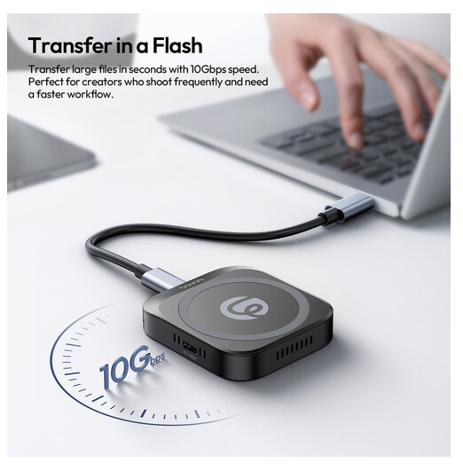 Das magnetische SSD-Gehäuse Ulanzi MA55 ist eine leistungsstarke und kompakte Speicherlösung, die speziell für Kreative und Profis entwickelt wurde, die viel unterwegs sind. Es unterstützt eine einzelne NVMe M.2 2230- oder 2242-SSD (bis zu 2 TB), sodass Sie hochwertige Inhalte mühelos speichern und übertragen können. Das Gehäuse verfügt über einen 10 Gb/s USB-C 3.2 Gen 2-Anschluss für schnelle Datenübertragung, einen USB-C 2.0-Anschluss und einen USB-C PD 3.0-Anschluss, der bis zu 100 W Eingangsleistung und 85 W Ausgangsleistung unterstützt und sich perfekt für die Stromversorgung Ihrer Geräte bei längeren Dreharbeiten eignet. Mit dem MA55 können Sie 4K-ProRes-Videos direkt von Ihrem Smartphone auf die SSD aufnehmen, wodurch wertvoller Speicherplatz auf dem Smartphone frei wird und gleichzeitig die hohe Qualität der Aufnahmen erhalten bleibt. Dank des eingebauten Lüfters und des robusten Gehäuses aus Aluminiumlegierung bleibt das Gehäuse auch bei hoher Auslastung kühl und arbeitet zuverlässig. Das magnetische Befestigungsdesign sorgt für eine schnelle und einfache Einrichtung, indem das Gehäuse sicher an Ihrem Smartphone oder anderen Geräten befestigt wird. Damit ist es die ideale Lösung für mobile Filmemacher, Fotografen und Technikbegeisterte, die einen effizienten, tragbaren Speicher und einen verbesserten Workflow benötigen. Das MA55 ist mit mehreren Betriebssystemen kompatibel, darunter Windows, macOS, Linux, HarmonyOS, iOS und iPadOS.
