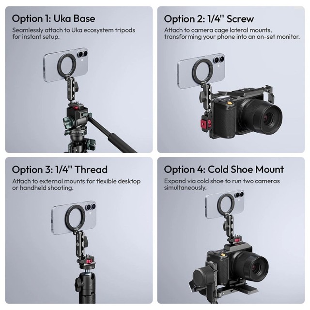 - Uka-Basis: Lässt sich nahtlos an Stativen des Uka-Ökosystems befestigen und ist sofort einsatzbereit.