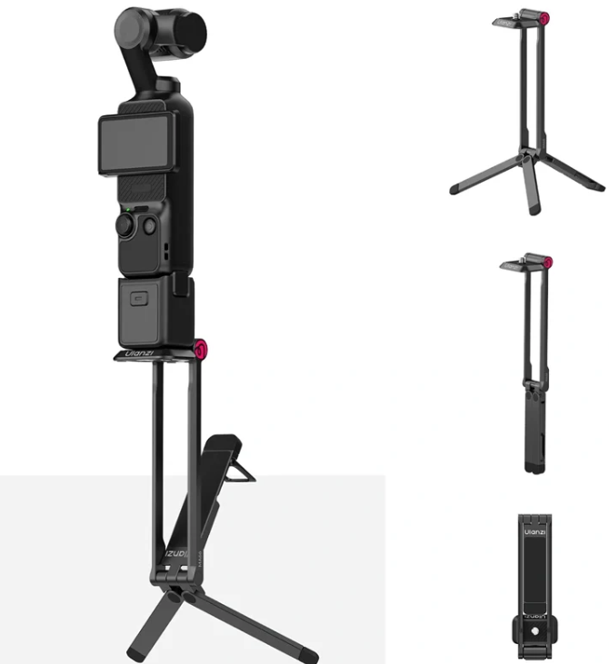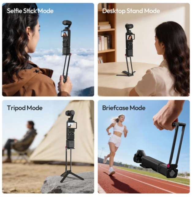 Die integrierte 1/4-Zoll-Rändelschraube ermöglicht eine kratzerfreie Befestigung, während die Ladeanschlüsse frei bleiben, sodass Sie Ihr Gerät während der Nutzung aufladen können. Das vielseitige Design des Stativs unterstützt mehrere Aufnahmemodi: Handheld-Selfie-Stick, Tischständer, Stativ und sogar Aufnahmen von oben im Mantis-Stil.