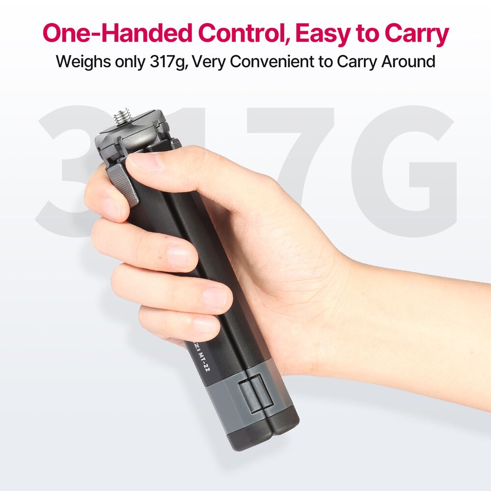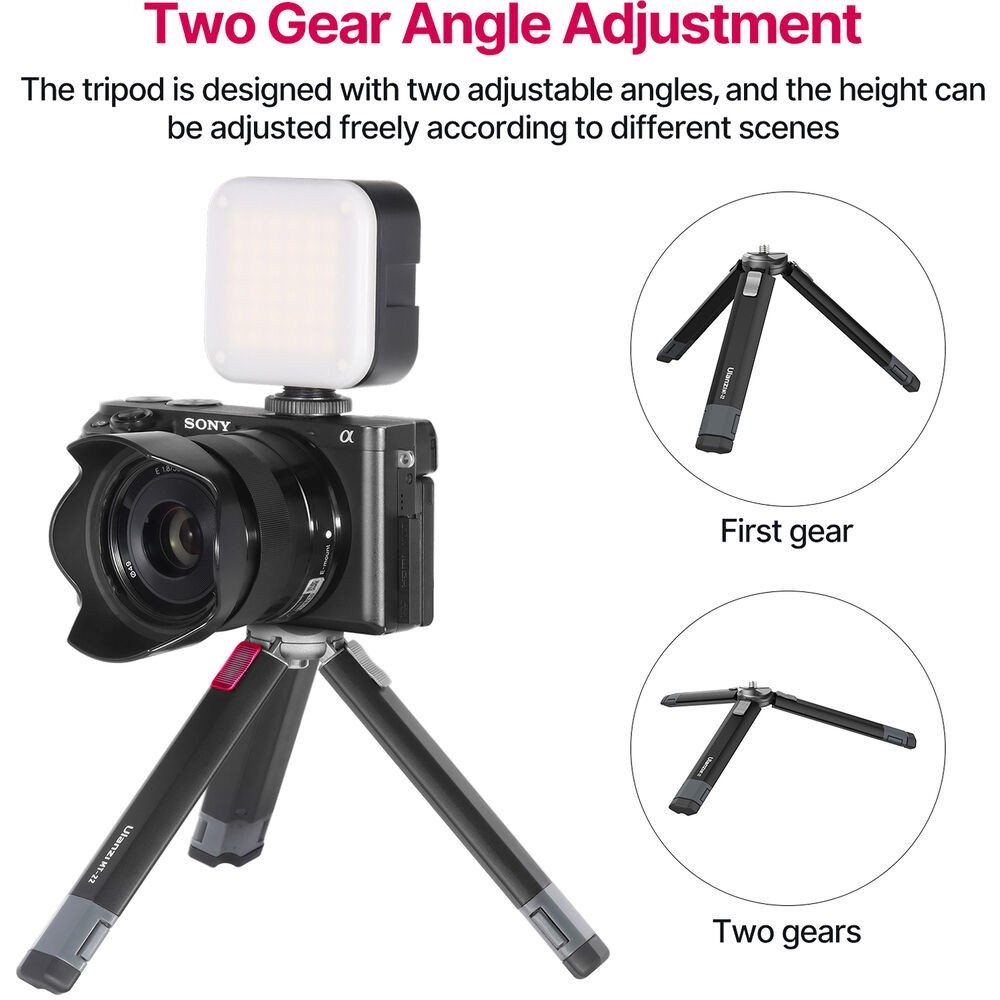 Das Ulanzi MT-22 ist ein kompaktes Mini-Stativ aus Metall mit einer 1/4"-20-Halterung, das bis zu 2,5 kg tragen kann. Seine zweiteiligen Push-Pull-Beine ermöglichen einen schnellen Aufbau, einstellbare Winkel und Aufnahmen aus niedriger Perspektive, wodurch es sich perfekt für Actionkameras, kompakte spiegellose Kameras oder Webcams eignet.