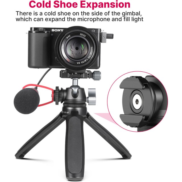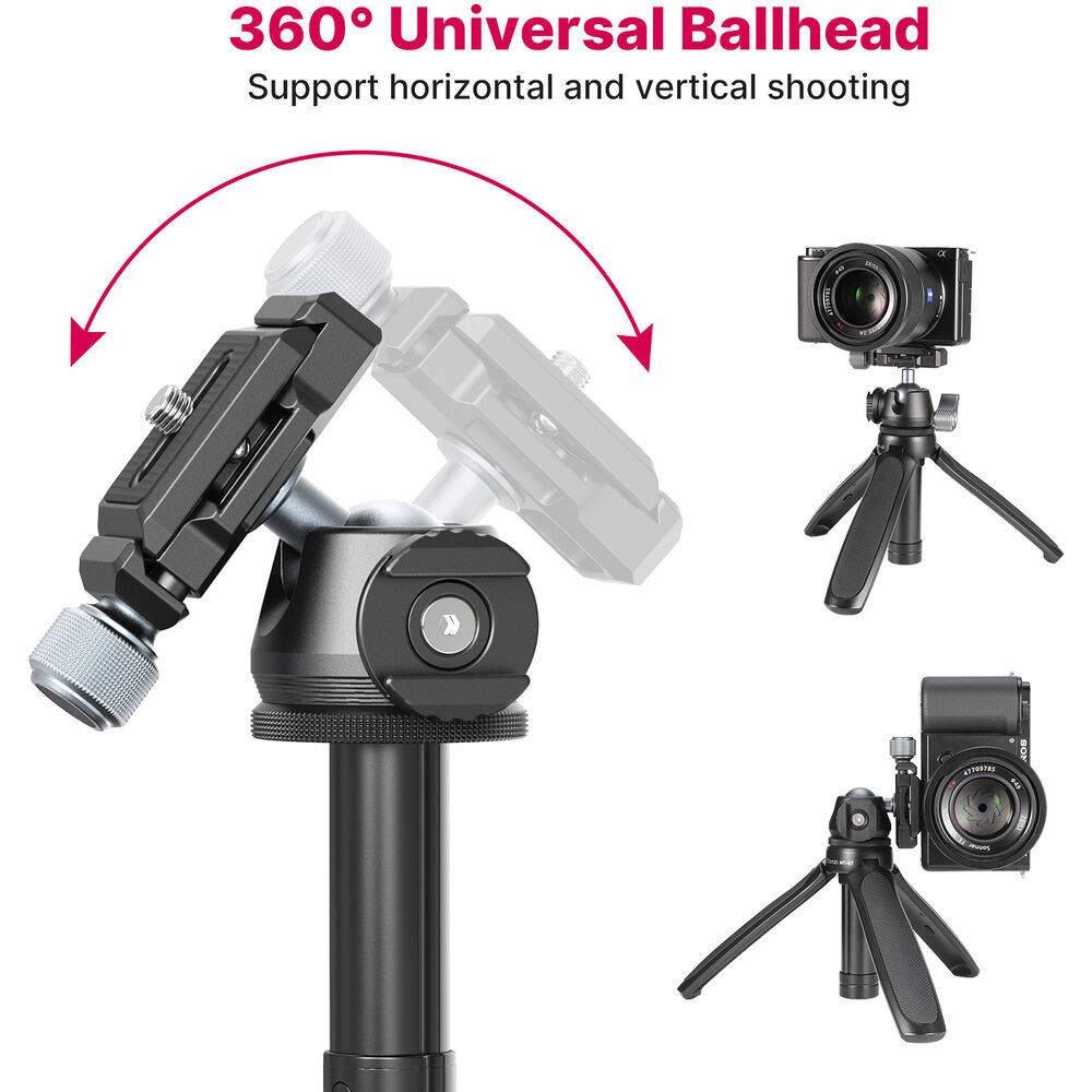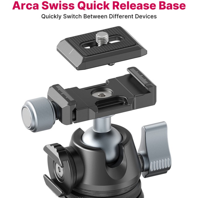 Der integrierte Kugelkopf ermöglicht eine sanfte 360°-Panorama-Drehung und eine vertikale Neigung von 90°, sodass schnell zwischen Quer- und Hochformat gewechselt werden kann. Ein einziger Verriegelungshebel macht die Einstellungen schnell und intuitiv. Das herausragende Merkmal ist die schlanke Arca-Schnellwechselplatte, mit der Sie Ihre Kamera ohne Werkzeug schnell montieren und abnehmen können. Darüber hinaus können Sie mit der drehbaren Blitzschuhhalterung Zubehör wie Mikrofone, LED-Leuchten oder Monitore anbringen, um eine kompakte, professionelle Aufnahmeausrüstung zusammenzustellen.