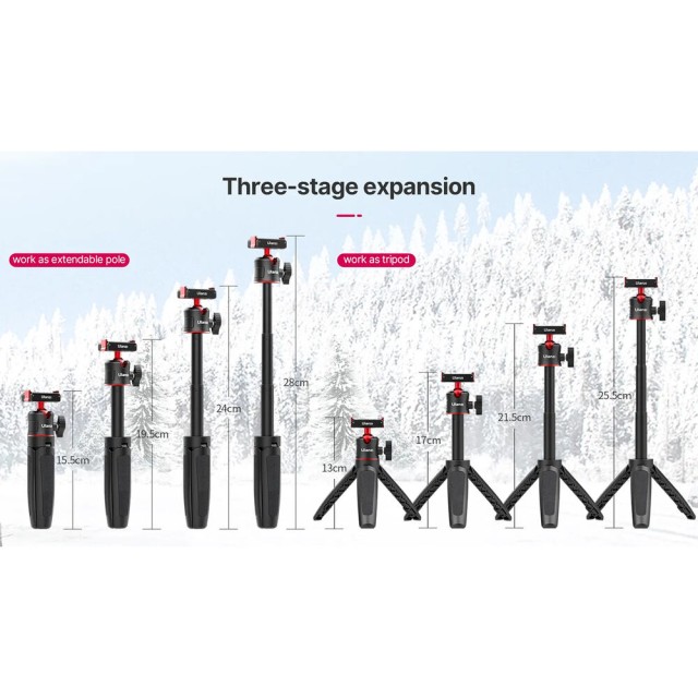 Dieses leichte Stativ lässt sich im Stativmodus von 13 cm auf 25,5 cm ausziehen und erreicht als Hand-Selfie-Stick eine Länge von 28 cm. Es besteht aus Aluminium, ABS-Kunststoff und Silikon, verfügt über rutschfeste Griffbereiche und ist staub- und wasserdicht, sodass es auch unter extremen Bedingungen zuverlässig funktioniert. Dank seiner kompakten Länge von 15,5 cm im zusammengeklappten Zustand lässt sich das Stativ leicht in einem Rucksack oder einer Tasche transportieren und eignet sich somit perfekt für Outdoor-, Abenteuer- und Reiseaufnahmen.