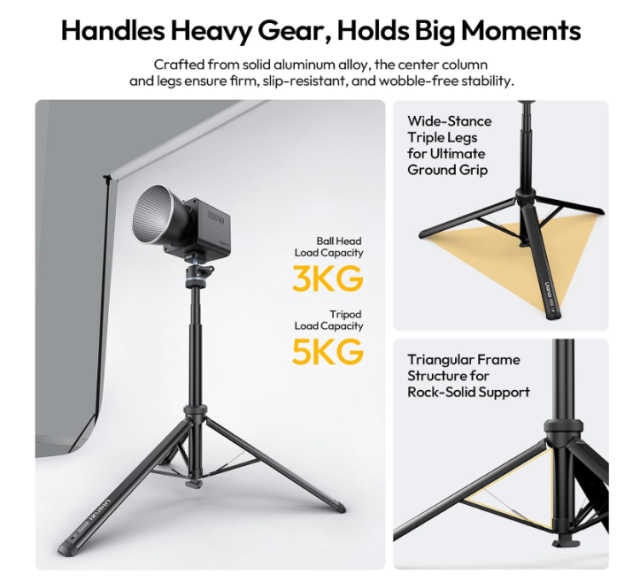 Der integrierte 360°-Panorama-Kugelkopf ermöglicht eine präzise Positionierung und einen schnellen Wechsel zwischen horizontaler und vertikaler Ausrichtung, was ihn ideal für Fotografie, Videografie, Live-Streaming und Beleuchtungsaufbauten macht. Das Uka-Schnellwechselsystem sorgt für eine schnelle und sichere Befestigung, während eine Sicherheitsverriegelung ein versehentliches Lösen verhindert.