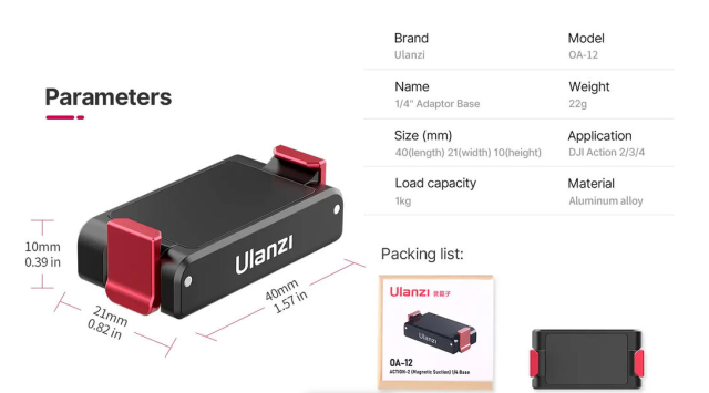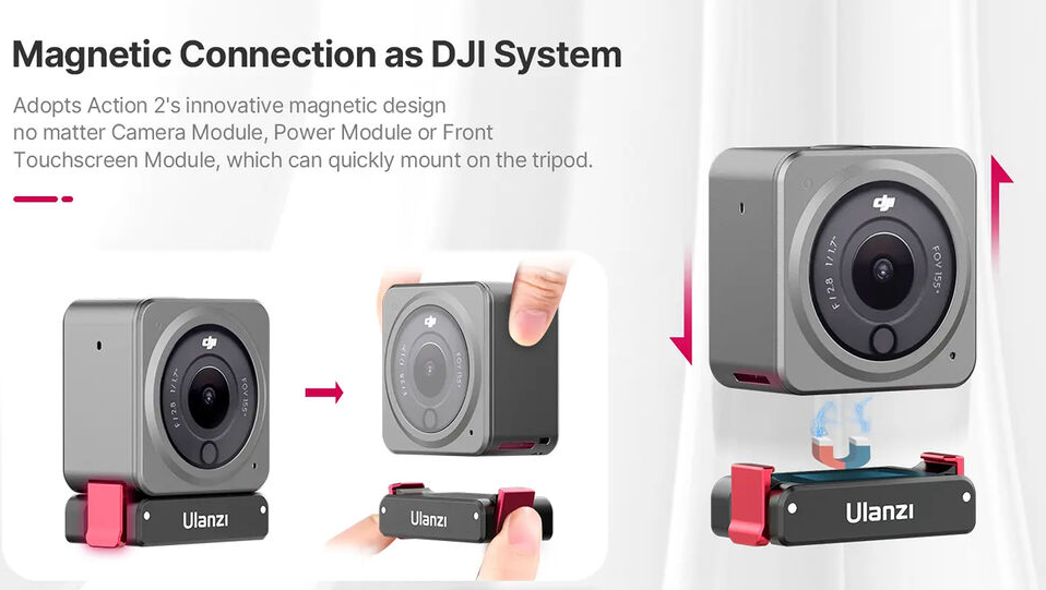 Die magnetische 1/4"-20-Basis Ulanzi 2846A ermöglicht eine schnelle und sichere magnetische Befestigung an DJI Action 2-, 3- und 4-Kameras und lässt sich einfach an Stativen, Magic Arms und anderen Halterungen anbringen.