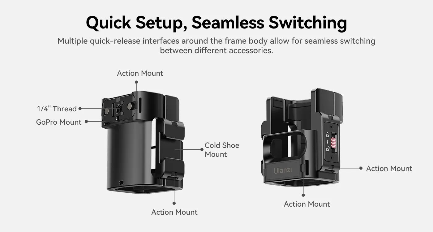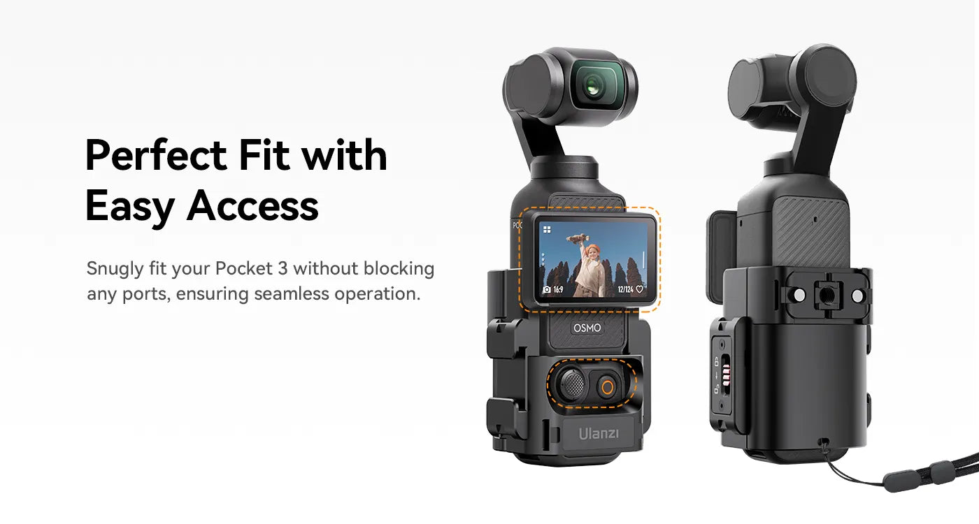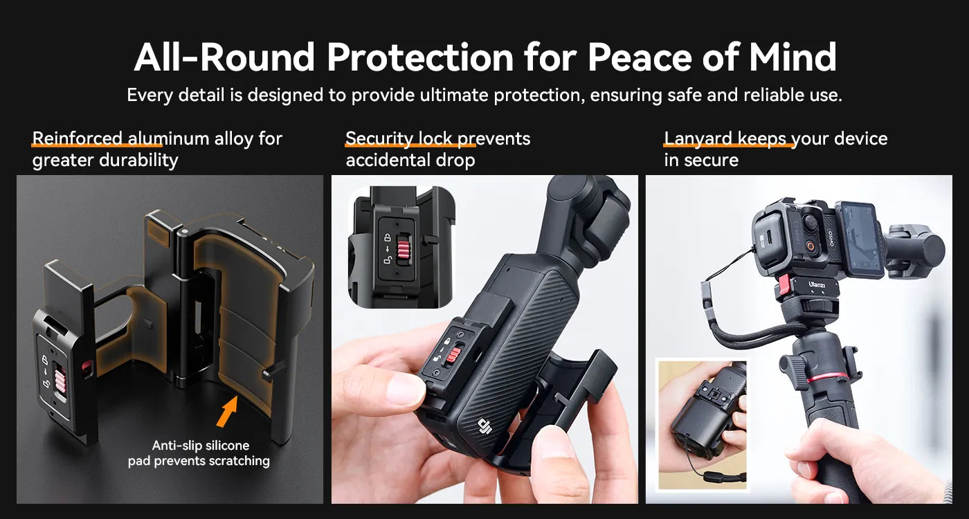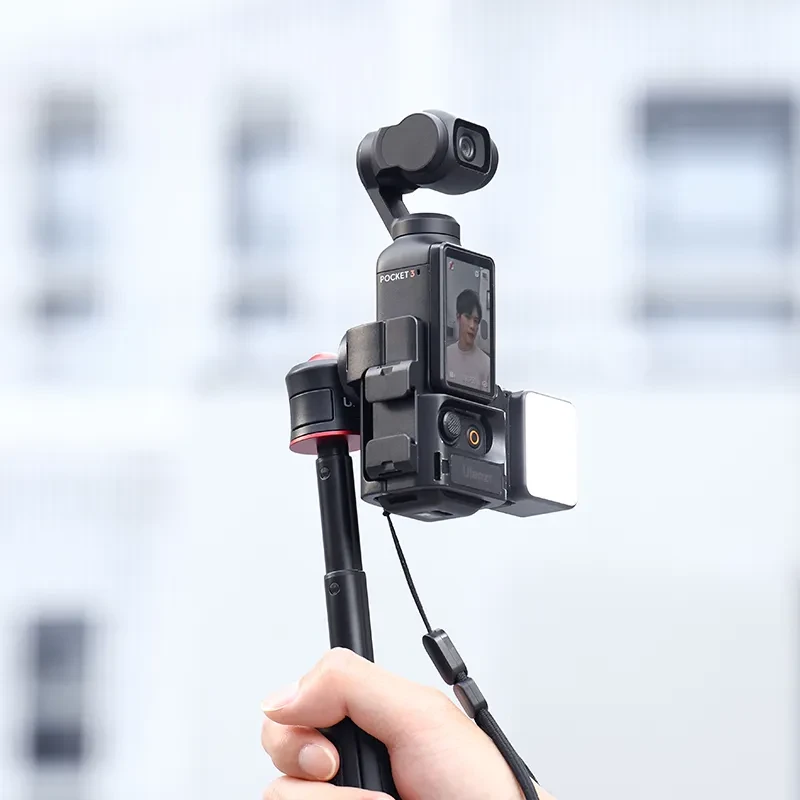 Der Ulanzi PK-06 Erweiterungsadapter C014 ist eine robuste Halterung aus Aluminiumlegierung, die Ihr DJI Osmo Pocket 3-Setup aufwertet. Mit seinem sicheren Drehverschluss verfügt er über ein 1/4-Zoll-Gewinde und Action-Cam-Halterungen für nahtlose Landschafts- oder Porträtaufnahmen. Er ist mit Stativen, Fahrradklammern und vielem mehr kompatibel und ermöglicht es Kreativen, ihre Ausrüstung ohne Unterbrechung der Aufnahme zu betreiben. Kompakt, langlebig und vielseitig – dieser Adapter ist ein Muss für mobile Filmemacher und Vlogger.