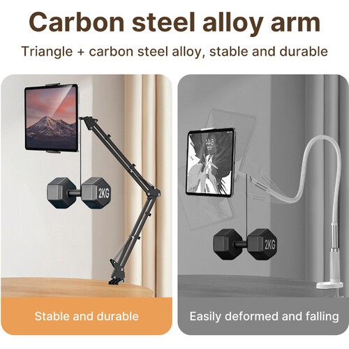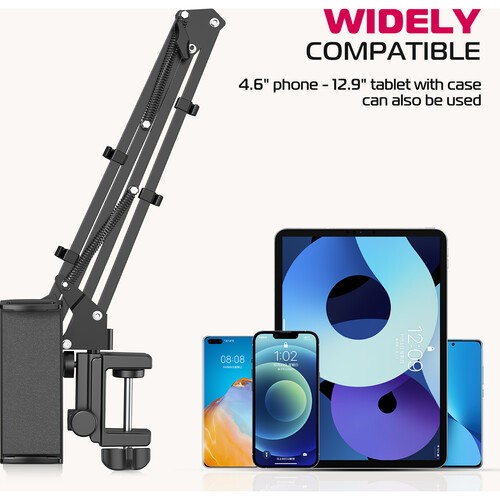 Diese Dual-Arm-Tischhalterung für Smartphones und Tablets von Ulanzi ähnelt herkömmlichen Schreibtischlampen und wurde entwickelt, um Ihnen ein ergonomischeres, komfortableres und vielseitigeres Seherlebnis beim Livestreaming, beim Surfen in sozialen Medien im Bett oder beim Videochatten mit Ihren Lieben zu bieten. Die Klemme lässt sich sicher an jedem Schreibtisch, Kopfteil oder Pfosten mit einer Dicke oder einem Umfang von bis zu 4 cm befestigen. Die federbelastete Klemme kann Geräte mit einer Breite von 11,5 cm bis 33 cm aufnehmen und eignet sich somit ideal für Smartphones bis hin zu großen Tablets. Nach der Installation können Sie dank einer drehbaren Basis, drei Drehpunkten und einer 10 cm langen Halterung mit 360°-Geräterotation einen extrem großen Einstell- und Ausziehbereich genießen. Mit dem doppelten 33-cm-Doppelfedermechanismus kann die Einstellung mit einer Hand vorgenommen werden und bleibt stabil.