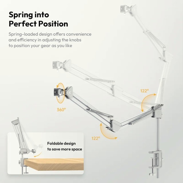 Ausgestattet mit dem Uka-Schnellwechselsystem ist die TH04 mit Schnellwechselplatten vom Typ Uka, F38 und Arca kompatibel, was eine schnelle Einrichtung und einen nahtlosen Gerätewechsel ermöglicht. Der Arm lässt sich bis zu 910 mm ausfahren und bietet so eine echte Perspektive von oben, die sich ideal für Tutorials, Unboxings, Kochvideos und Tischaufnahmen eignet. Das klappbare, abnehmbare Armdesign spart Platz und verbessert die Tragbarkeit, während die 68-mm-C-Klemme einen starken, zuverlässigen Halt auf den meisten Schreibtischen und Tischen gewährleistet. Ob im Studio oder vor Ort – der TH04 vereint Flexibilität, Stabilität und Effizienz in einer kompakten Überkopf-Befestigungslösung.