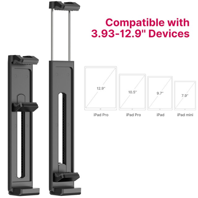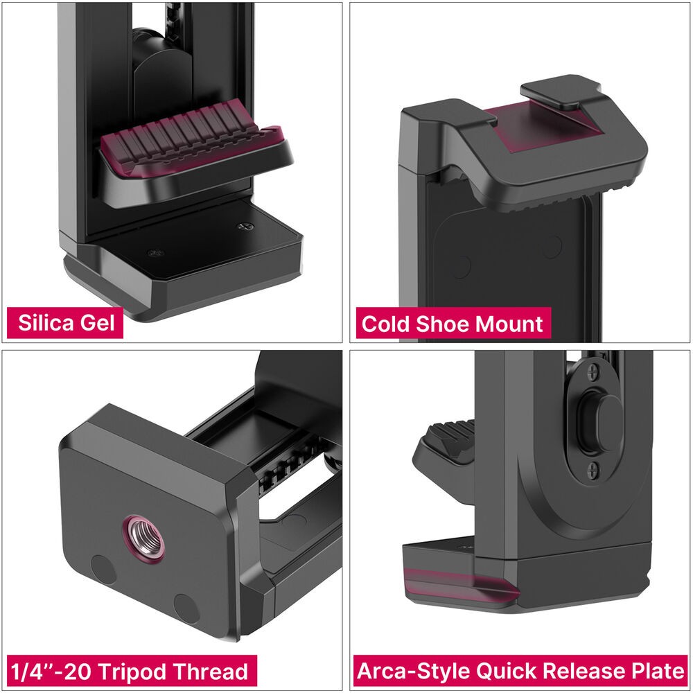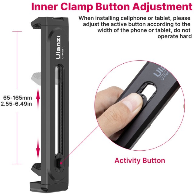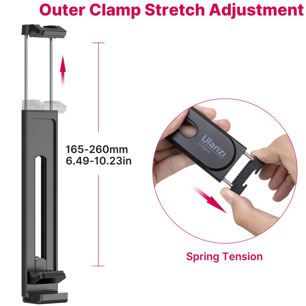Das Ulanzi U-Pad II ist eine vielseitige Stativklemme, die Smartphones oder Tablets mit einer Breite von 2,6 bis 10,2 Zoll sicher hält. Es verfügt über Druckknopf- und federbelastete Klemmen, 1/4-Zoll- und Arca-Style-Halterungen sowie einen oberen Blitzschuh für Zubehör.