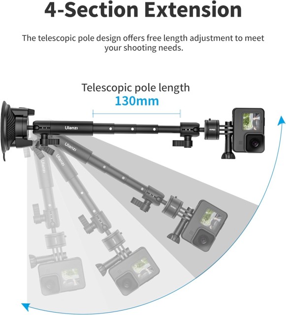 Der Teleskoparm der Halterung umfasst vier ausziehbare Stangen, die eine Verstellung um bis zu 13 cm ermöglichen, um unabhängig von der Oberflächenplatzierung die perfekte Perspektive zu erzielen. Die ZJ01 ist ideal für POV-Videos, die Befestigung an Fahrzeugen, Desktop-Setups oder flexible Aufnahmen im Innen- und Außenbereich und kombiniert Stabilität, Vielseitigkeit und Komfort für Content-Ersteller, die viel unterwegs sind.