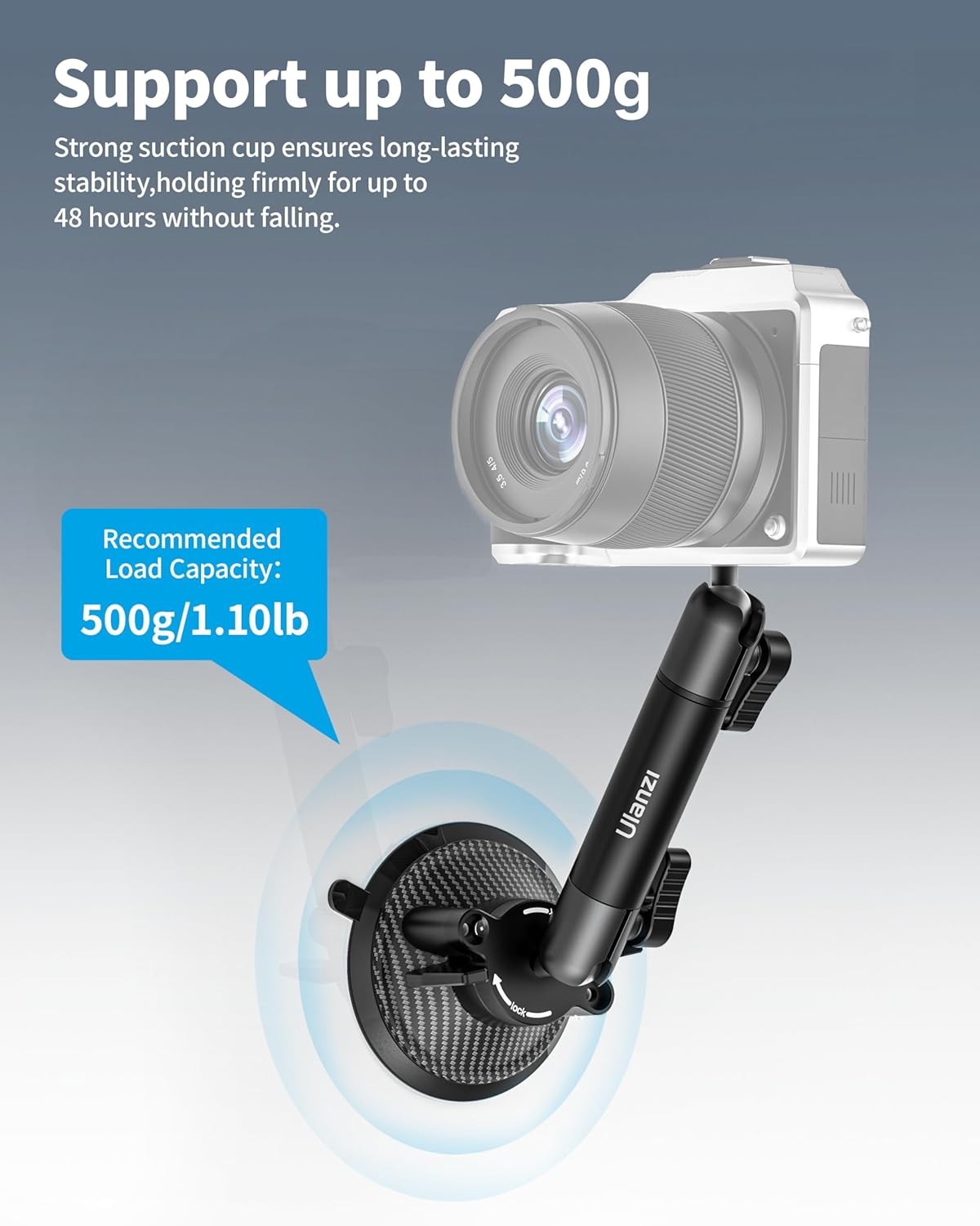 Mit der magnetischen Saugnapfhalterung Ulanzi ZJ01, die für Actionkameras, Smartphones und GoPro-ähnliche Halterungen entwickelt wurde, können Sie mühelos jeden Winkel einfangen. Die Halterung lässt sich mit ihrem robusten Saugnapf in Sekundenschnelle an glatten Oberflächen befestigen, trägt Geräte mit einem Gewicht von bis zu 500 g und bleibt bis zu 48 Stunden lang stabil. Der innovative 360°-Doppelkugelkopf ermöglicht eine nahtlose horizontale und vertikale Drehung, sodass Sie die volle Kontrolle über die Kamerapositionierung für kreative Aufnahmen haben.