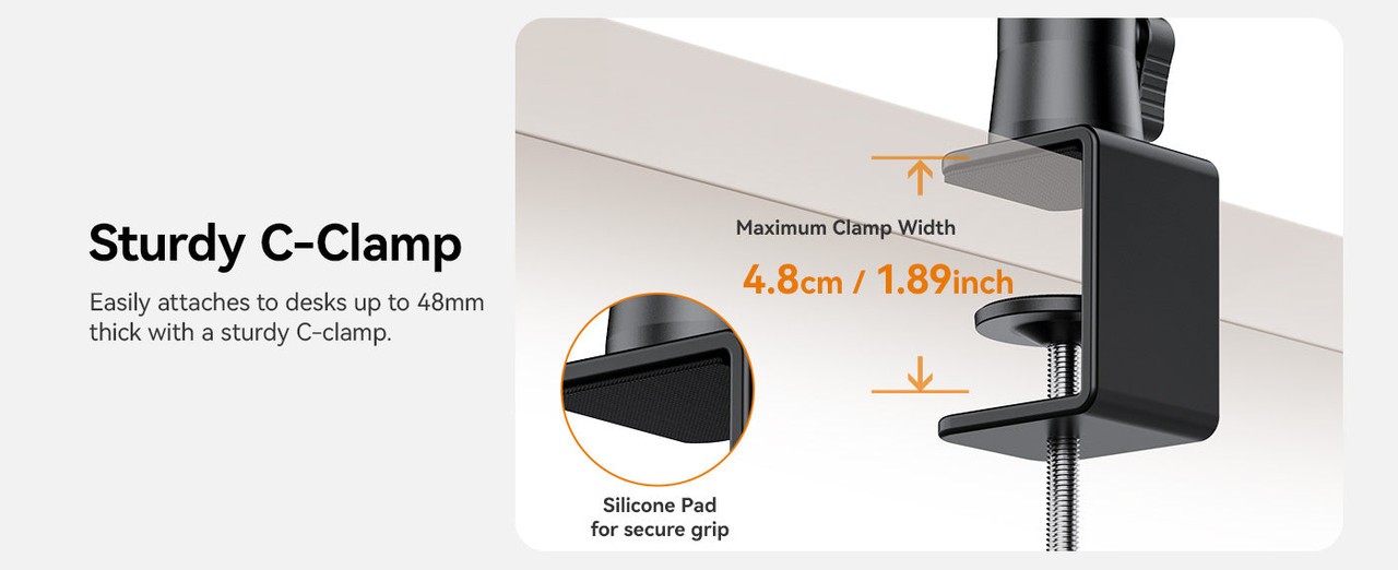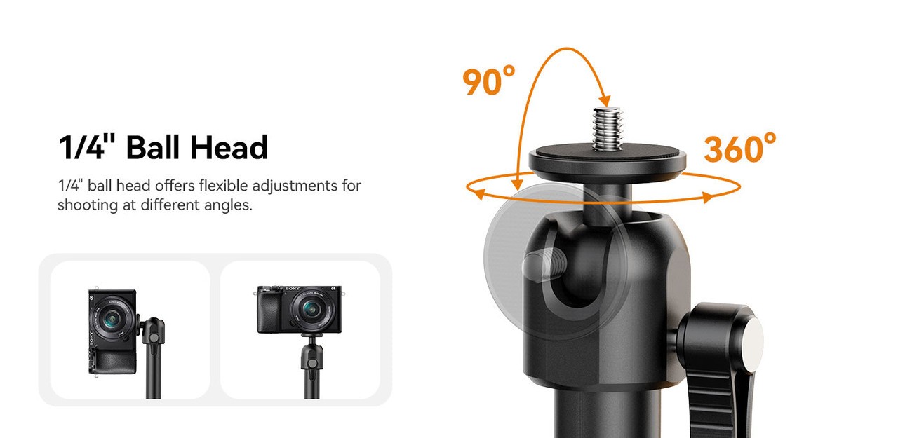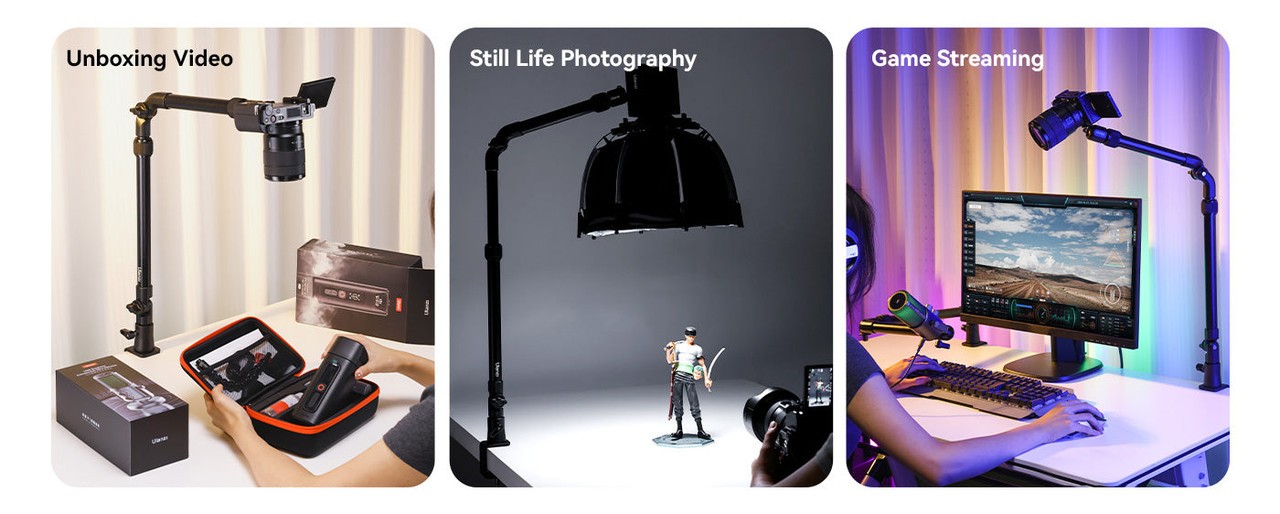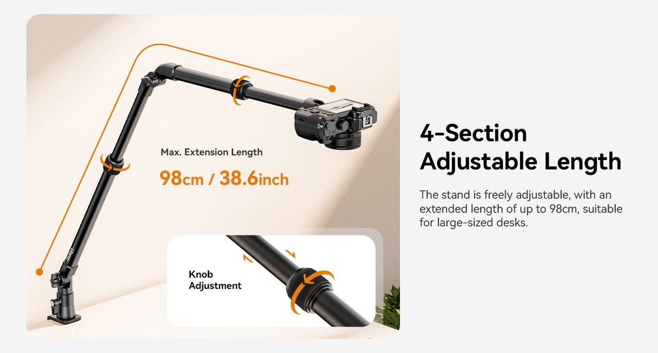 Fangen Sie den perfekten Winkel ein – mit dem Ulanzi ZJ02 Kamera-Tischständer mit C-Klemme und Haltearm. Diese Halterung wurde für maximale Flexibilität entwickelt und verfügt über Zahnverbindungen, die eine 180°-Verstellung ermöglichen und eine Vielzahl von Aufnahmepositionen zulassen. Der Überkopfarm lässt sich bis zu 65 cm ausfahren und eignet sich ideal für Flatlay-Fotografie, während der gesamte Ständer bis zu 123 cm ausziehbar ist und somit auch für größere Schreibtische geeignet ist. Er besteht aus einer strapazierfähigen Aluminiumlegierung und Kunststoff und kann Geräte mit einem Gewicht von bis zu 2 kg sicher halten. Ein 1/4"-Kugelkopf ermöglicht präzise Winkeleinstellungen, und die robuste C-Klemme mit Silikonpolster sorgt für einen sicheren Halt auf Schreibtischen mit einer Dicke von bis zu 48 mm. Der ZJ02 ist leicht und dennoch robust und eignet sich perfekt für Content-Ersteller, Fotografen und Videografen, die Stabilität und Vielseitigkeit in einer Halterung suchen.