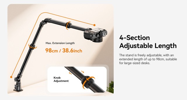 Die Ulanzi ZJ02 C-Clip-Klapphalterung ist eine vielseitige Tischhalterung aus Aluminium mit einem flexiblen Haltearm, die sich perfekt für Flat-Lay-Fotografie, Streaming oder Aufnahmen von oben eignet. Sie ist bis zu 65 cm in der Höhe und 123 cm in der Länge verstellbar und hält Geräte mit einem Gewicht von bis zu 2 kg sicher mit einer robusten C-Klemme.