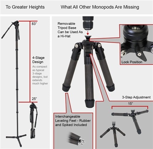 Die 4-stufige Carbonfaserkonstruktion lässt sich für den Transport auf eine kompakte Größe zusammenklappen und auf über 6,5 Fuß ausziehen, wobei eine hervorragende Steifigkeit erhalten bleibt. Hochwertige Drehverschlüsse sorgen für eine schnelle und sichere Höhenverstellung während der Aufnahme unterwegs. Die klappbare Stativbasis lässt sich für einen flexiblen Einsatz in drei Positionen arretieren und kann vollständig entfernt werden, um das System als Standard-Einbeinstativ zu verwenden. Verstellbare Gummifüße ermöglichen eine präzise Nivellierung, während die mitgelieferten Spikes zusätzliche Halt auf unebenen oder Außenflächen bieten.