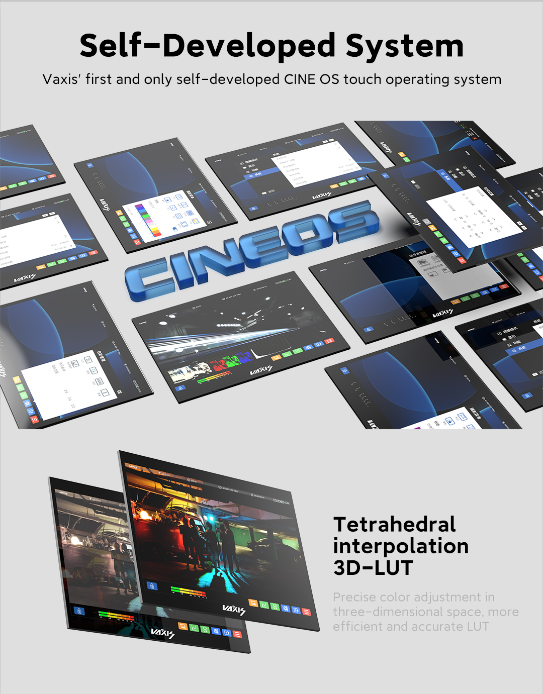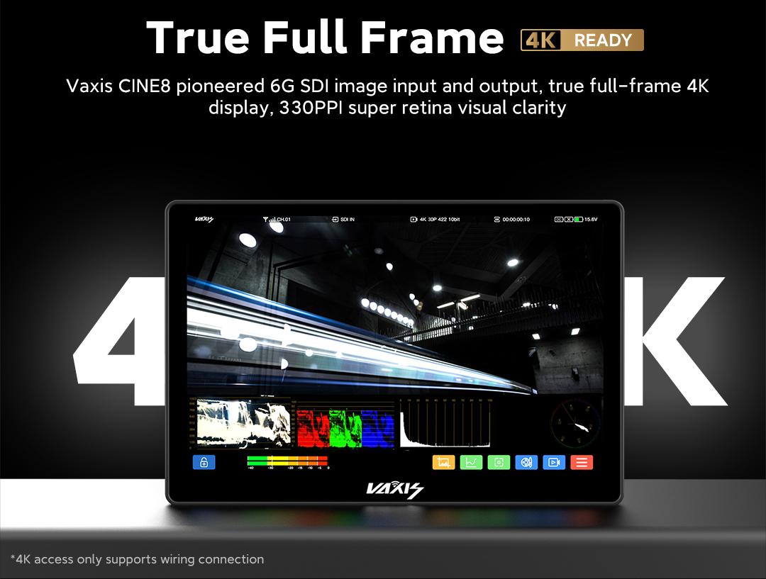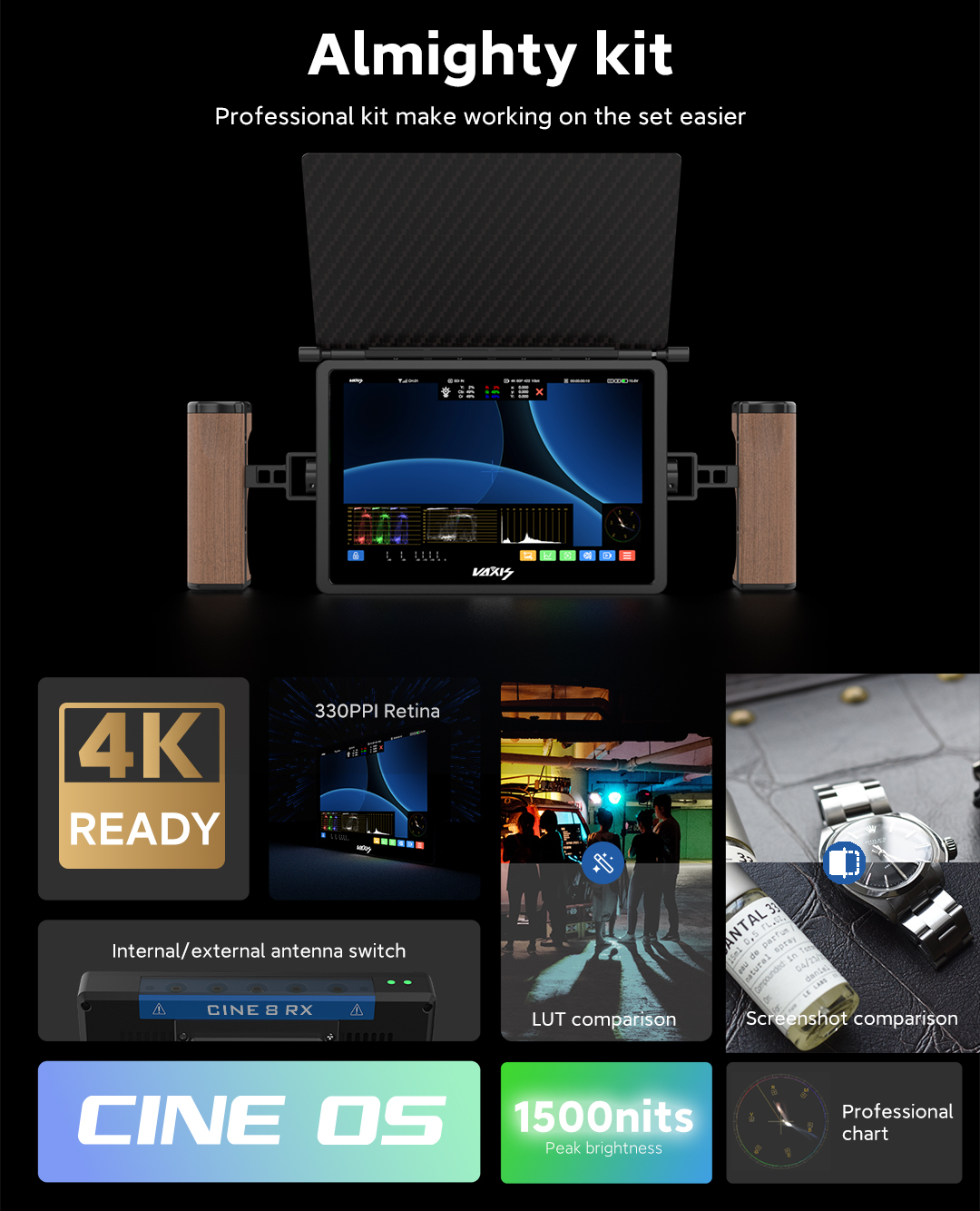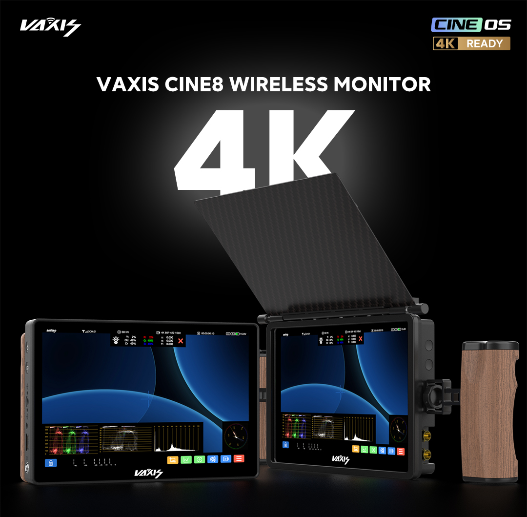 Vaxis Storm Cine 8 Monitor - 8,9-Zoll, 4K-Auflösung 2560x1600 Pixel, 1500 nits Spitzenhelligkeit - mit eingebautem Storm 3000 RX. Selbstentwickeltes System Das erste und einzige selbstentwickelte CINE OS Touch-Betriebssystem von Vaxis.Tetrahedral Interpolation 3D-LUT. Präzise Farbanpassung im dreidimensionalen Raum, effizientere und genauere LUT. Bild-im-Bild-Modus. Mehrkanaliger Zugriff auf den Bildschirm, Änderung der Bild-im-Bild-Anzeigeposition an beliebiger Stelle. Vergleich von Bildschirmfotos und LUTS. Nicht-traditionelles Einfrieren des Bildes, echter Screenshot und das Echtzeitbild können direkt im System verglichen werden. Vielfältige drahtlose SteuerungHaben alle Funktionen des traditionellen drahtlosen Videosystems und optimierten die Interaktionsmethode. Bietet verschiedene Methoden zur Antennenauswahl und integriert eine Frequenzsweep-Funktion. Detaillierte Überwachung instrumentWaveform Graphen, Vektordiagramme, Histogramme, decken und enthalten alles.True Full Frame 4K READY. Vaxis CINE8 Pionier 6G SDI Bild Eingang und Ausgang, echte Full-Frame-4K-Display, 303PPI Super Retina visuelle Klarheit. 1+1 > 2Simultane Überwachung von Multi-Winkel-Bilder von AB-Kamera, unterstützt synchrone...