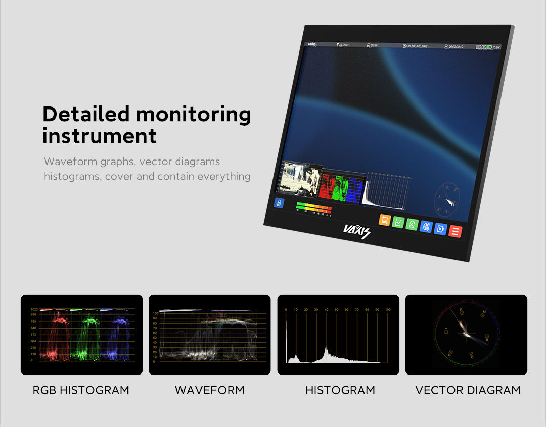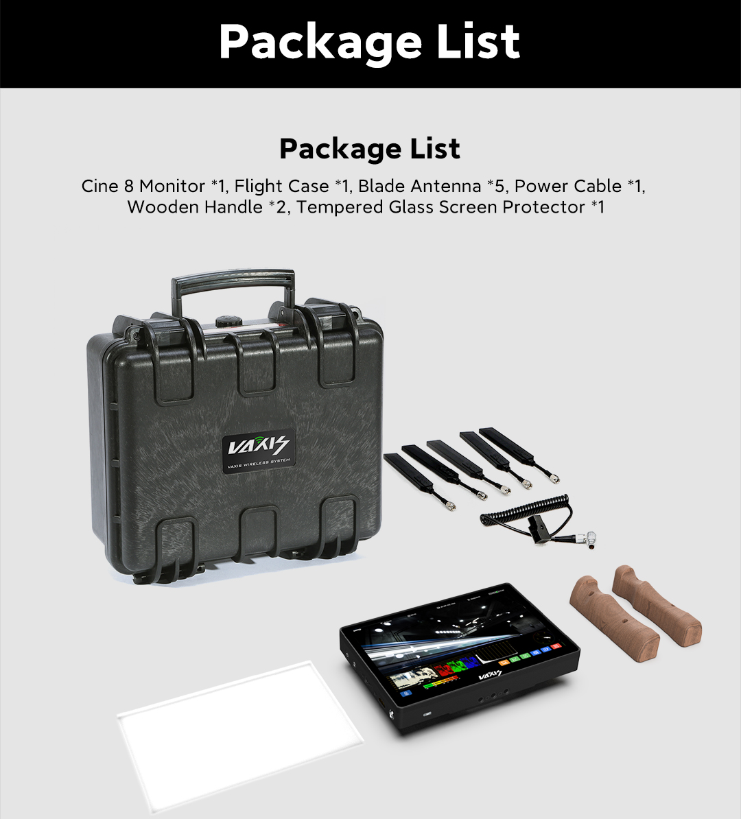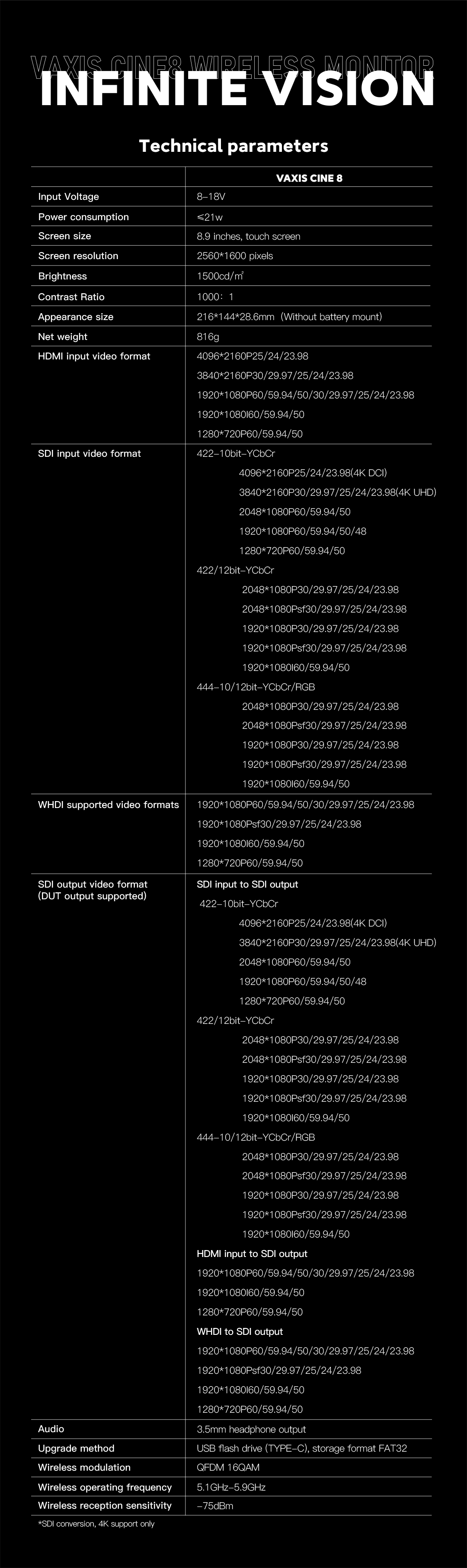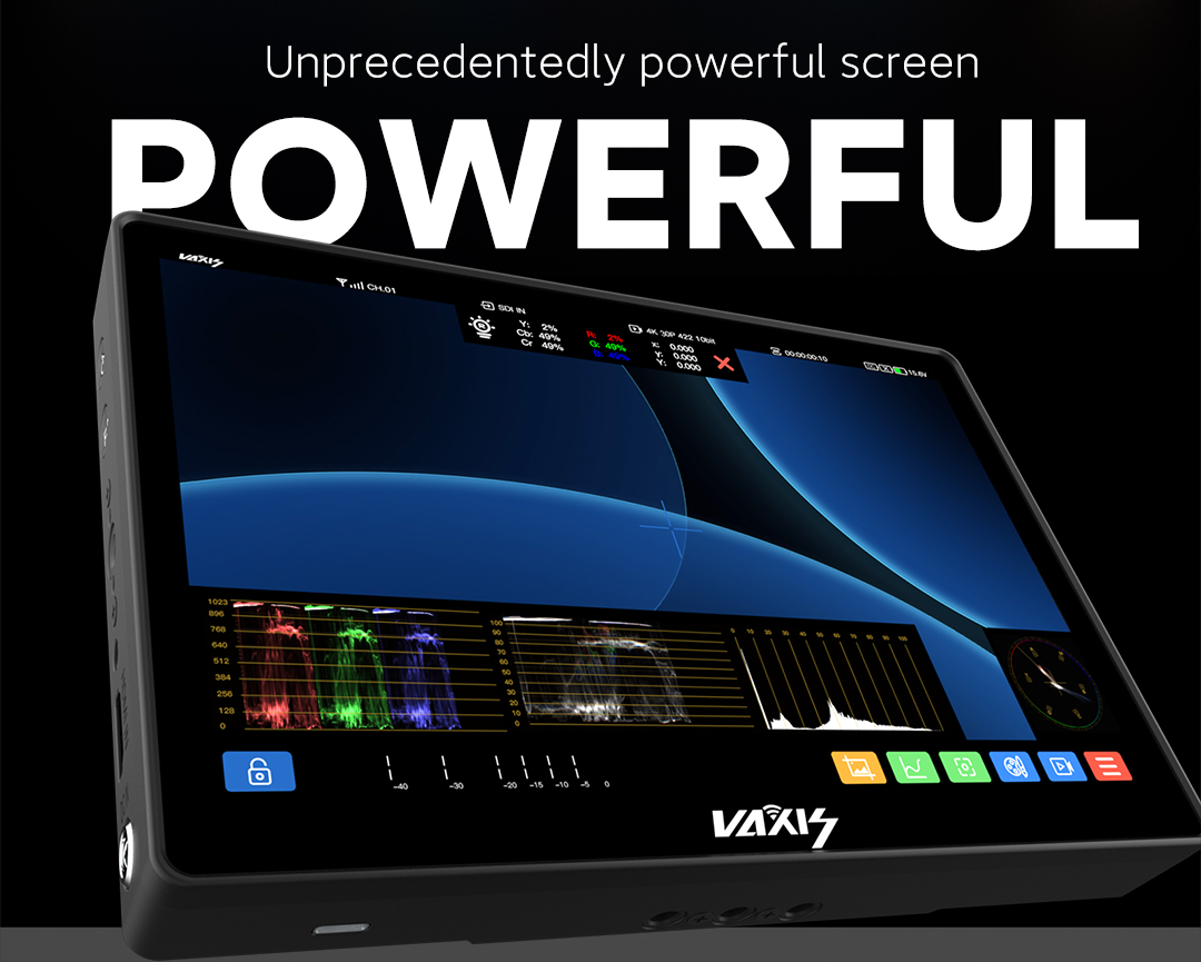 Vaxis Storm Cine 8 Monitor - 8,9-Zoll, 4K-Auflösung 2560x1600 Pixel, 1500 nits Spitzenhelligkeit - mit eingebautem Storm 3000 RX. Selbstentwickeltes System Das erste und einzige selbstentwickelte CINE OS Touch-Betriebssystem von Vaxis.Tetrahedral Interpolation 3D-LUT. Präzise Farbanpassung im dreidimensionalen Raum, effizientere und genauere LUT. Bild-im-Bild-Modus. Mehrkanaliger Zugriff auf den Bildschirm, Änderung der Bild-im-Bild-Anzeigeposition an beliebiger Stelle. Vergleich von Bildschirmfotos und LUTS. Nicht-traditionelles Einfrieren des Bildes, echter Screenshot und das Echtzeitbild können direkt im System verglichen werden. Vielfältige drahtlose SteuerungHaben alle Funktionen des traditionellen drahtlosen Videosystems und optimierten die Interaktionsmethode. Bietet verschiedene Methoden zur Antennenauswahl und integriert eine Frequenzsweep-Funktion. Detaillierte Überwachung instrumentWaveform Graphen, Vektordiagramme, Histogramme, decken und enthalten alles.True Full Frame 4K READY. Vaxis CINE8 Pionier 6G SDI Bild Eingang und Ausgang, echte Full-Frame-4K-Display, 303PPI Super Retina visuelle Klarheit. 1+1 > 2Simultane Überwachung von Multi-Winkel-Bilder von AB-Kamera, unterstützt synchrone...