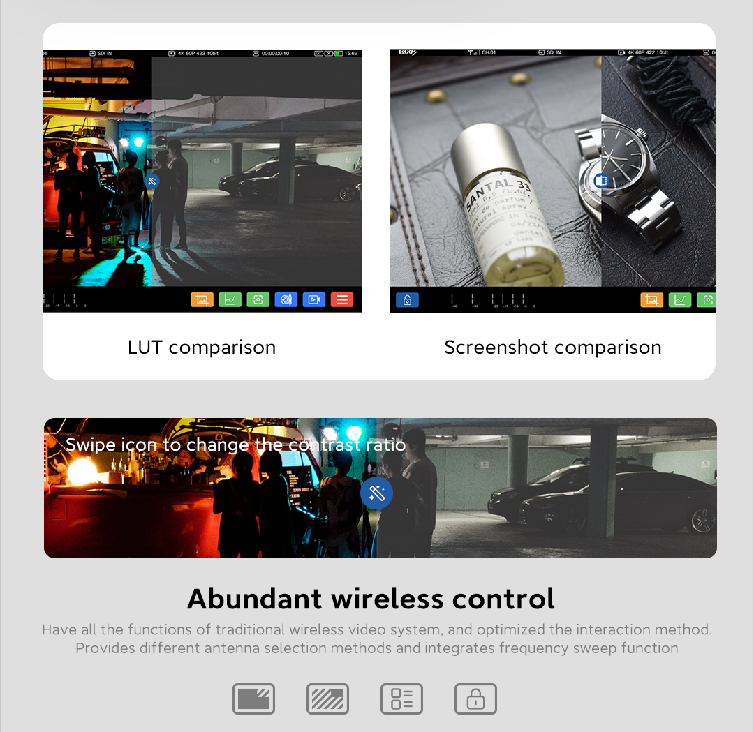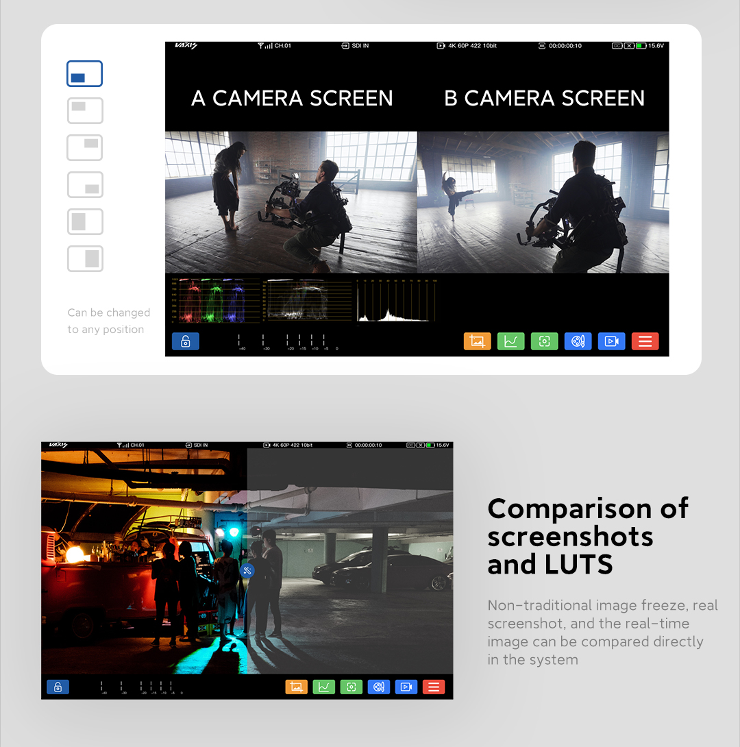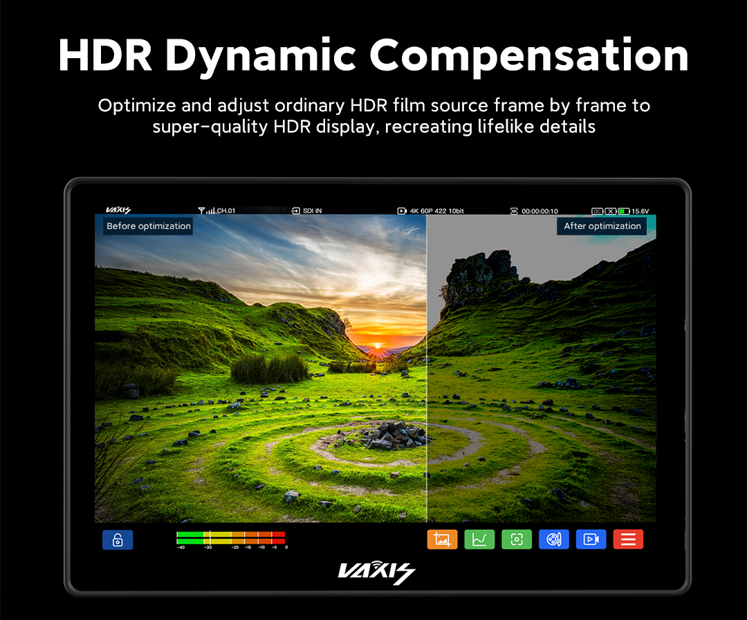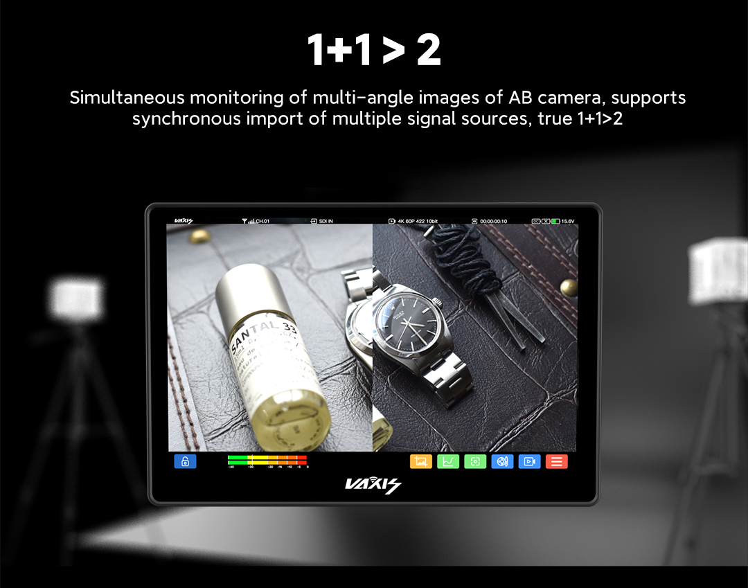 Vaxis Storm Cine 8 Monitor - 8,9-Zoll, 4K-Auflösung 2560x1600 Pixel, 1500 nits Spitzenhelligkeit - mit eingebautem Storm 3000 RX. Selbstentwickeltes System Das erste und einzige selbstentwickelte CINE OS Touch-Betriebssystem von Vaxis.Tetrahedral Interpolation 3D-LUT. Präzise Farbanpassung im dreidimensionalen Raum, effizientere und genauere LUT. Bild-im-Bild-Modus. Mehrkanaliger Zugriff auf den Bildschirm, Änderung der Bild-im-Bild-Anzeigeposition an beliebiger Stelle. Vergleich von Bildschirmfotos und LUTS. Nicht-traditionelles Einfrieren des Bildes, echter Screenshot und das Echtzeitbild können direkt im System verglichen werden. Vielfältige drahtlose SteuerungHaben alle Funktionen des traditionellen drahtlosen Videosystems und optimierten die Interaktionsmethode. Bietet verschiedene Methoden zur Antennenauswahl und integriert eine Frequenzsweep-Funktion. Detaillierte Überwachung instrumentWaveform Graphen, Vektordiagramme, Histogramme, decken und enthalten alles.True Full Frame 4K READY. Vaxis CINE8 Pionier 6G SDI Bild Eingang und Ausgang, echte Full-Frame-4K-Display, 303PPI Super Retina visuelle Klarheit. 1+1 > 2Simultane Überwachung von Multi-Winkel-Bilder von AB-Kamera, unterstützt synchrone...
