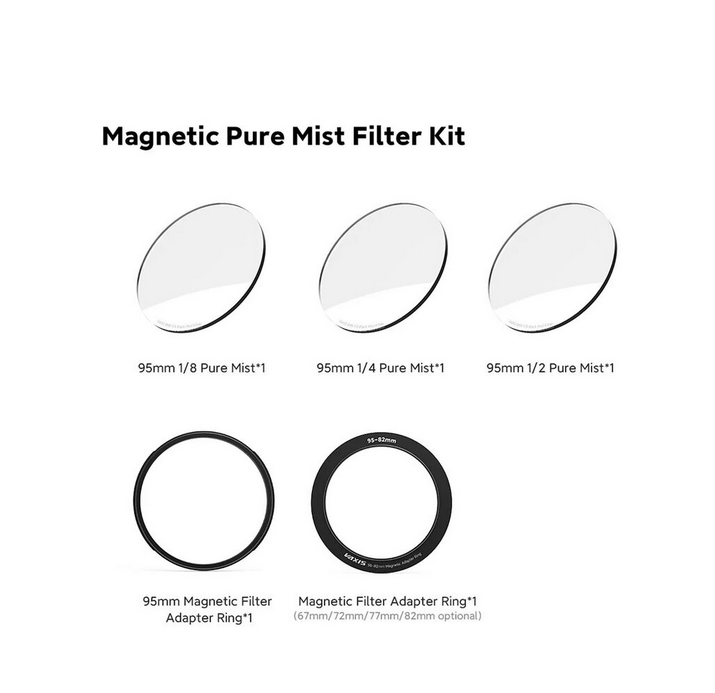 Das Vaxis 95 mm VFX Magnetic Pure Mist Filter Kit enthält drei Pure Mist-Filter in den Stärken 1/2, 1/4 und 1/8, die für die Tilta Mirage Matte Box entwickelt wurden, sowie einen 95 mm Magnetadapterring, der ein schnelles Auswechseln und Stapeln von Filtern auf 95 mm-Objektiven ohne Abschrauben ermöglicht und eine weiche Lichtqualität mit reduzierten Glanzlichtern und geringerem Kontrast für anpassbare Kinoeffekte liefert.