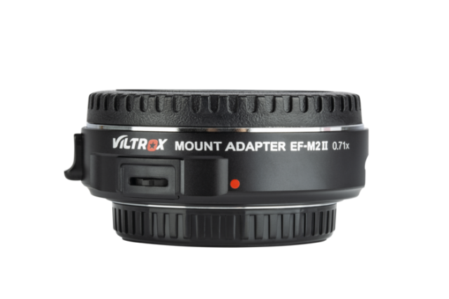 Dieser Viltrox "Speed Booster 0,71x" adaptiert nicht nur das MFT-Bajonett an Canon EF-Objektive, sondern reduziert auch die Brennweite der Objektive (0,71x) und erhöht deren Blende (bis zu einer Blendenzahl). Es bietet auch ein 1/4"-Gewinde für Kamerakäfige und AF-Unterstützung. 67x25 mm, Gewicht 85 g