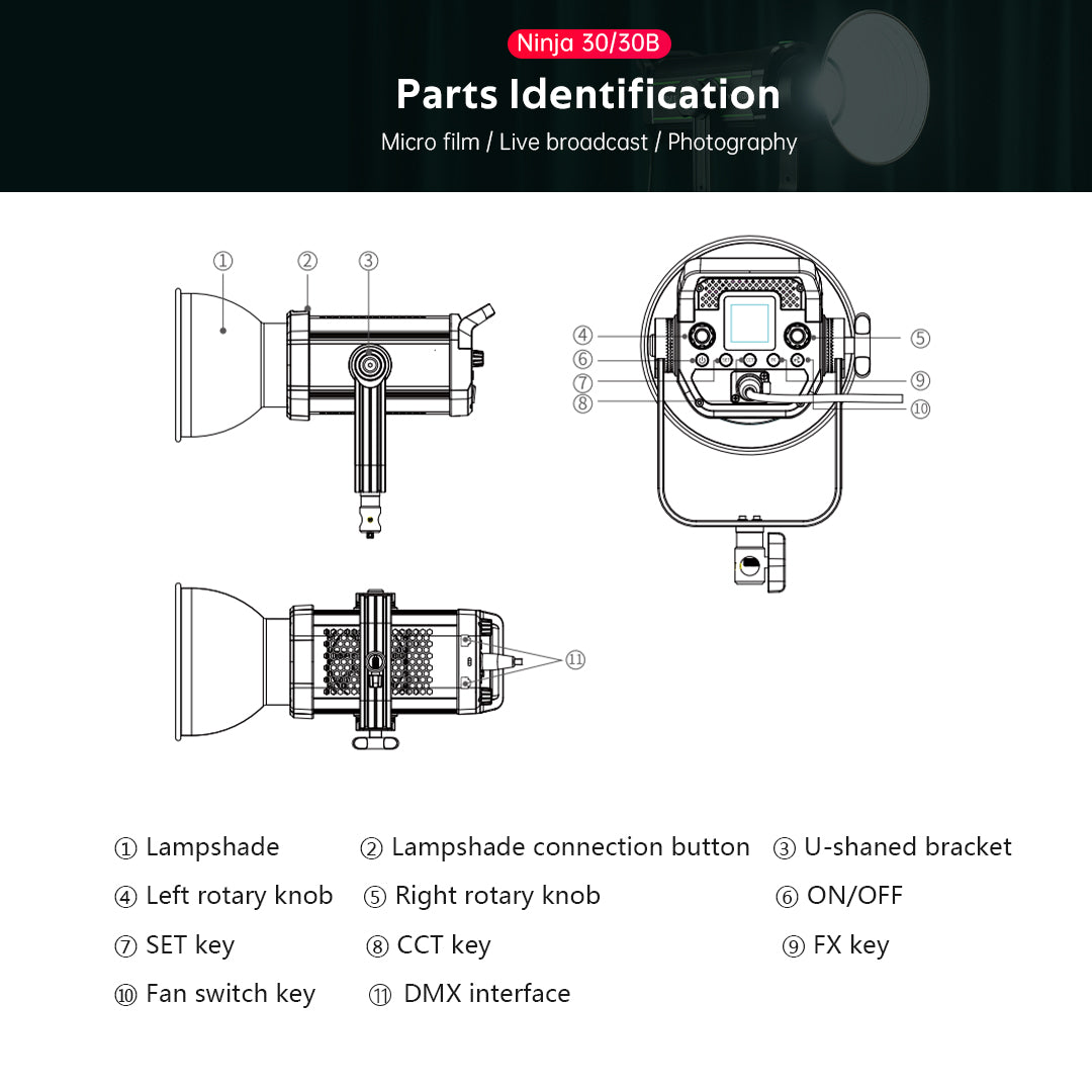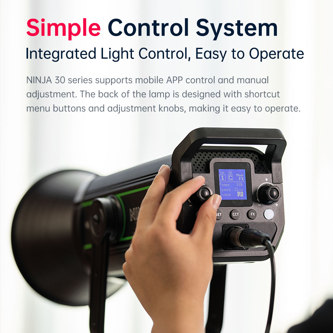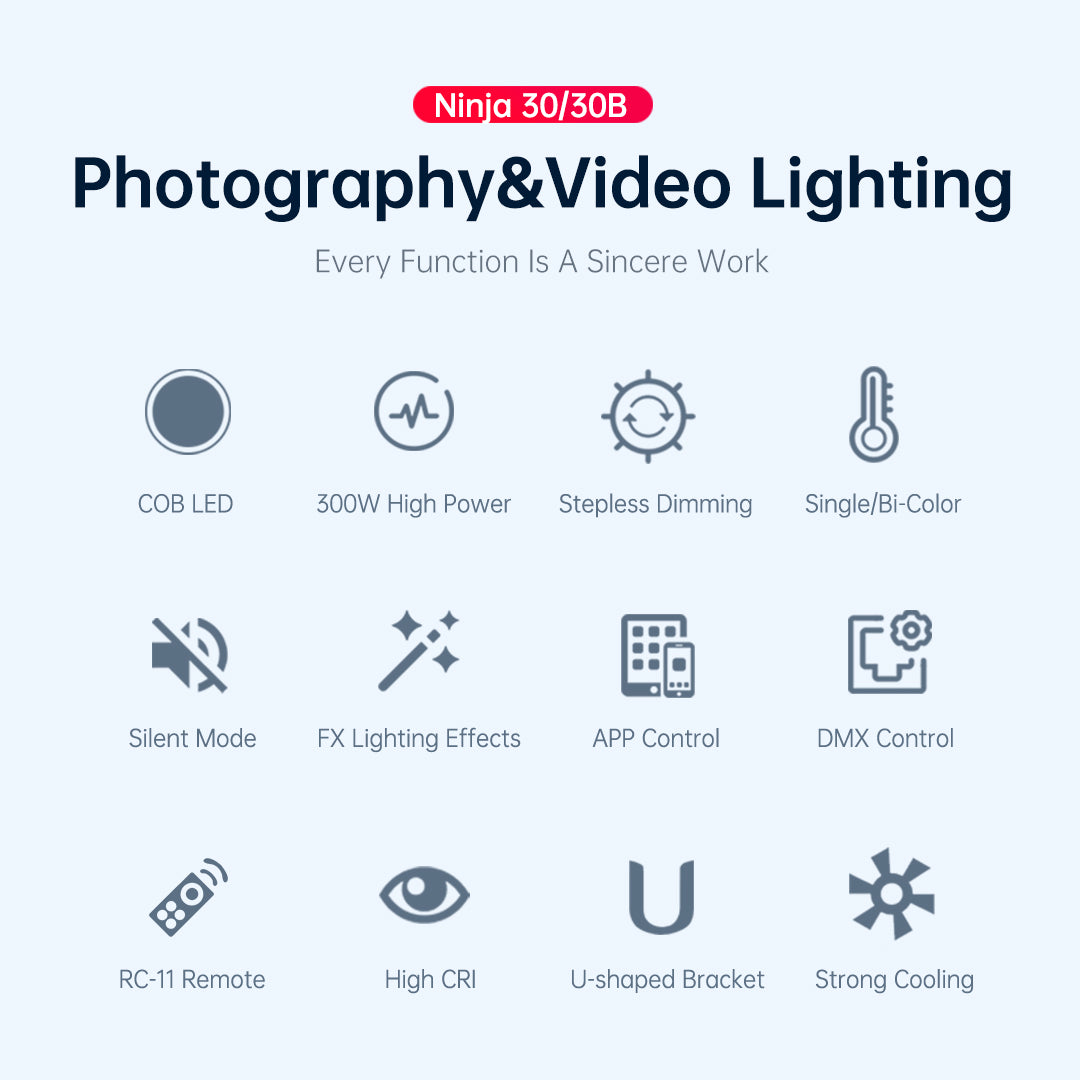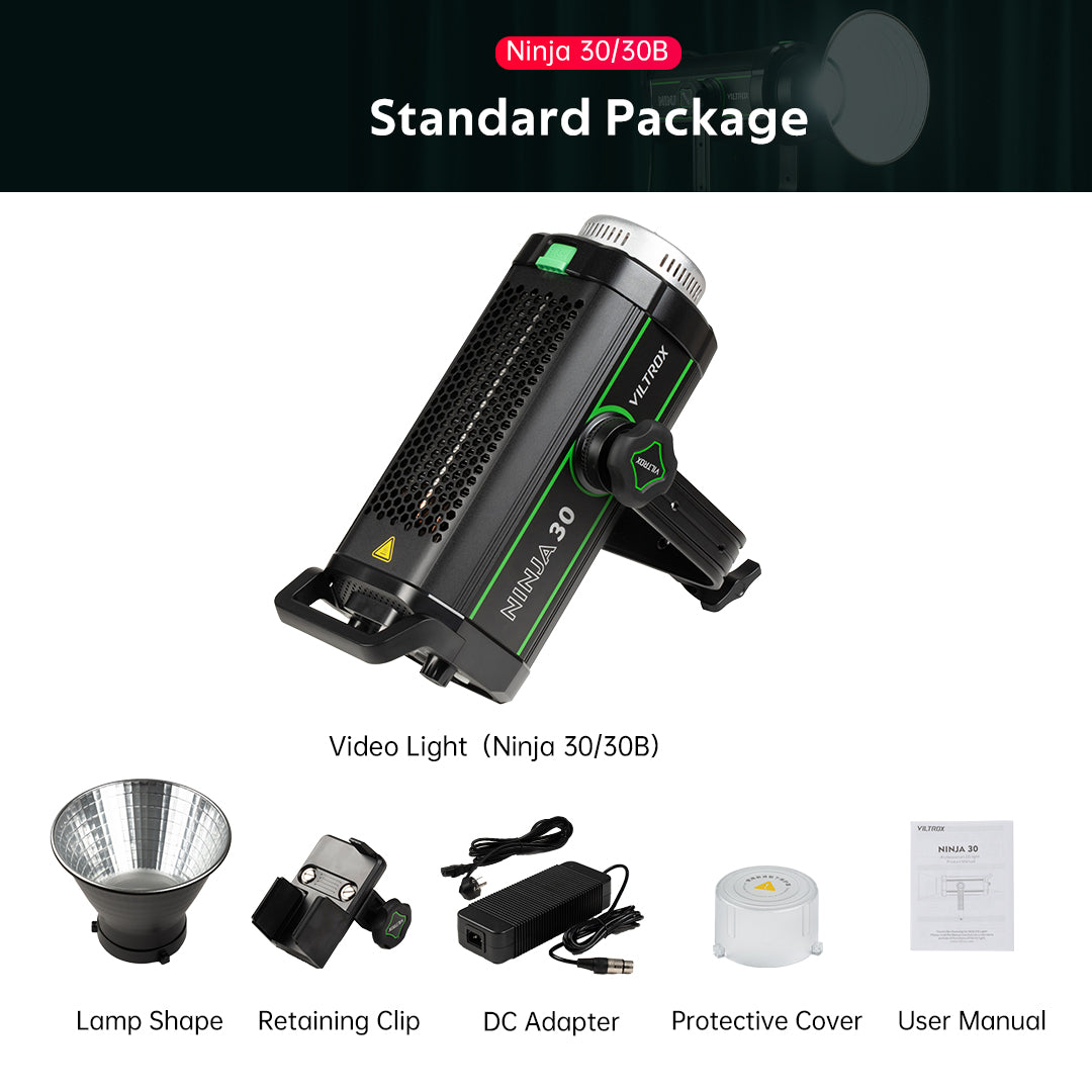 NINJA 30 Serie sind 300W Hochleistungs-Punktlichtquelle LED-Videoleuchte, mit hoher Beleuchtungsstärke Ausgang, unterstützt eine Vielzahl von professionellen Steuerungsmethoden, Standard-Bowen-Bajonett und eine Vielzahl von Lichtsteuerung Zubehör, hochwertige Luftfahrt-Aluminium-Metallgehäuse. Die Leistung der NINJA 30 Serie wurde in allen Aspekten beispiellos verbessert, um Ihnen eine professionellere und effizientere Film- und Fernsehbeleuchtung zu ermöglichen!