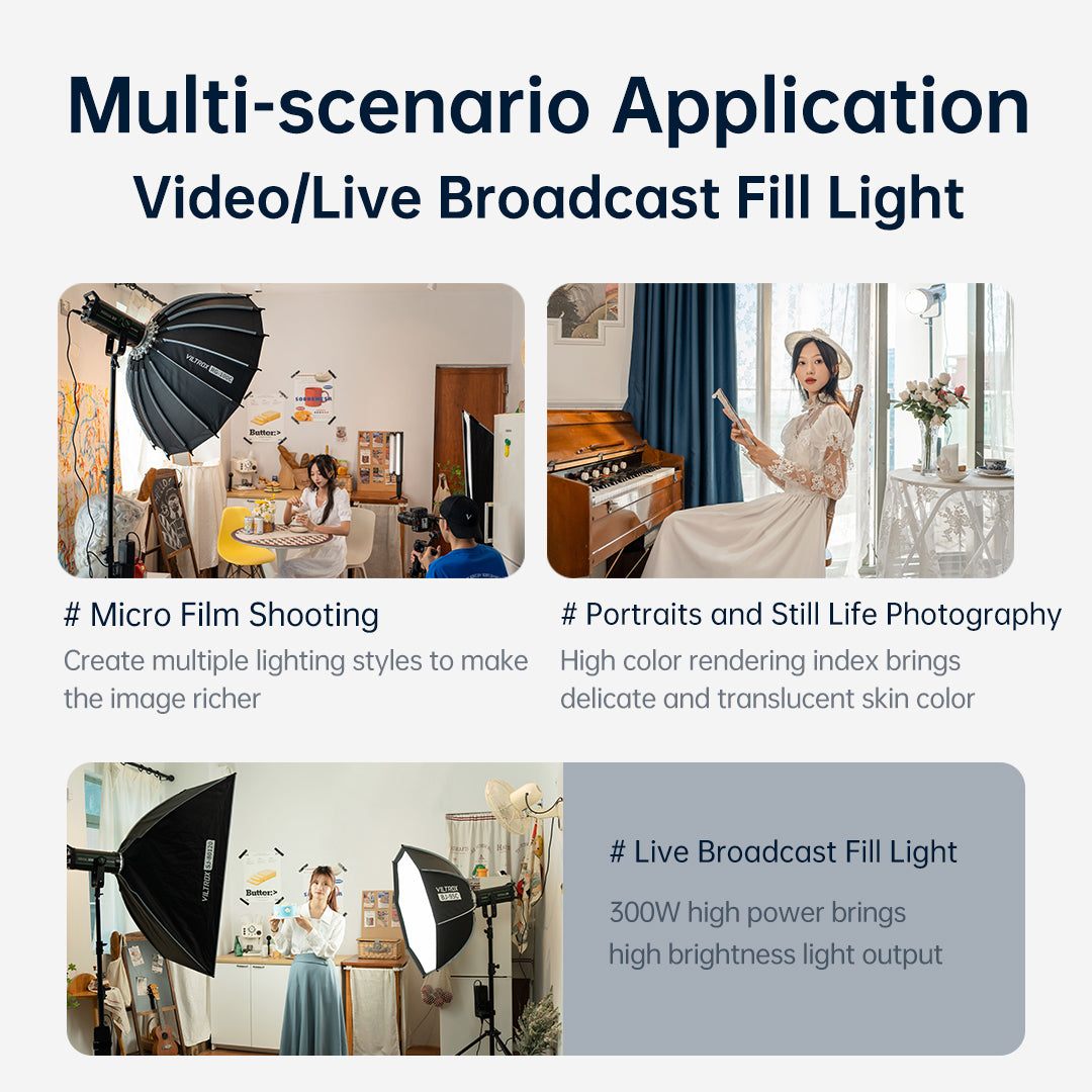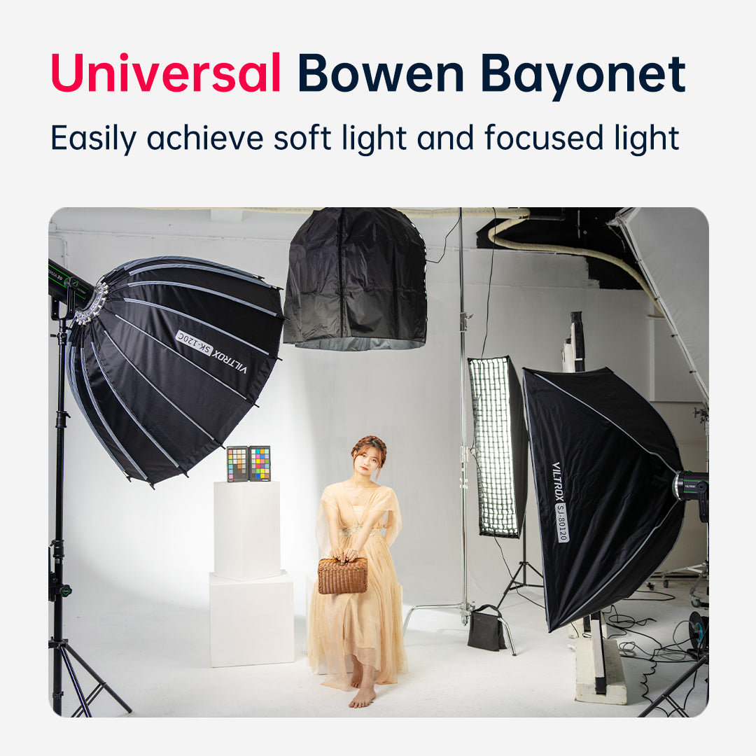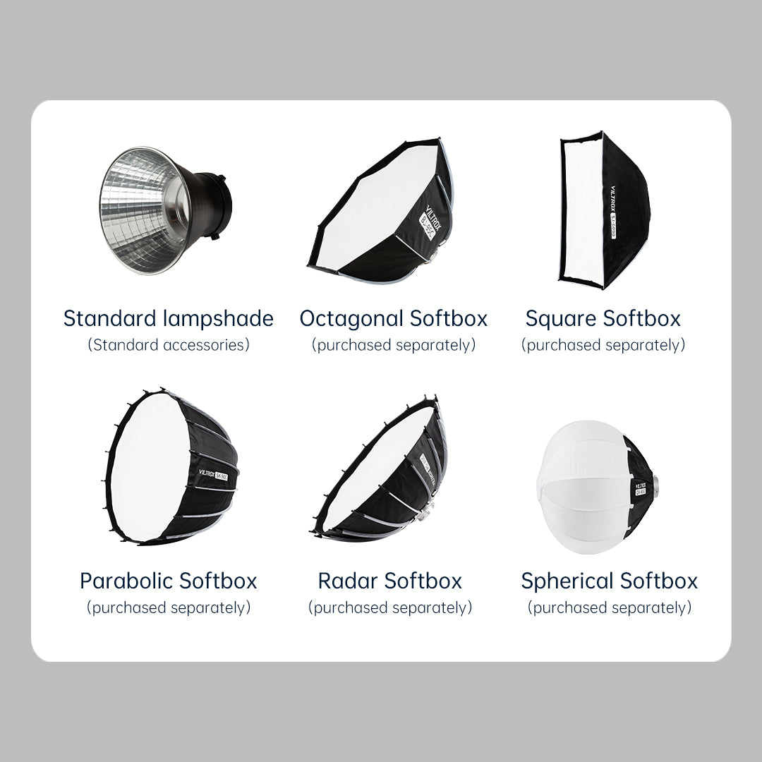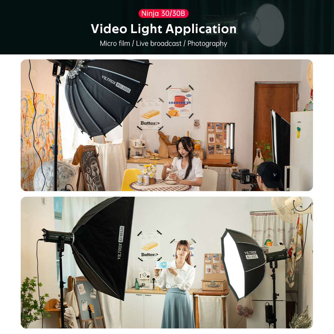Die NINJA 30 Serie ist mit dem branchenüblichen Bowen-Mount ausgestattet und mit dem VILTROX-Fotografiezubehör kompatibel: achteckige Softbox, tiefe parabolische Softbox, sphärischer Diffusor usw., um den Beleuchtungsbedarf bei verschiedenen Gelegenheiten zu decken.