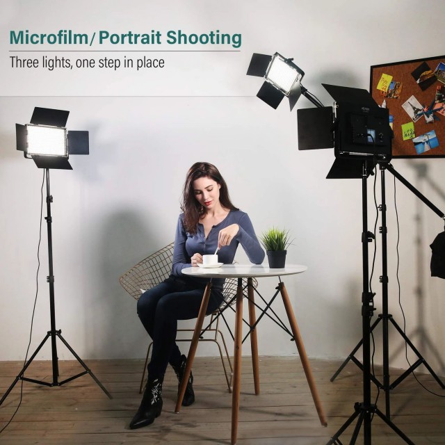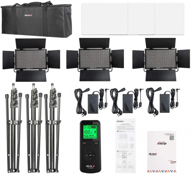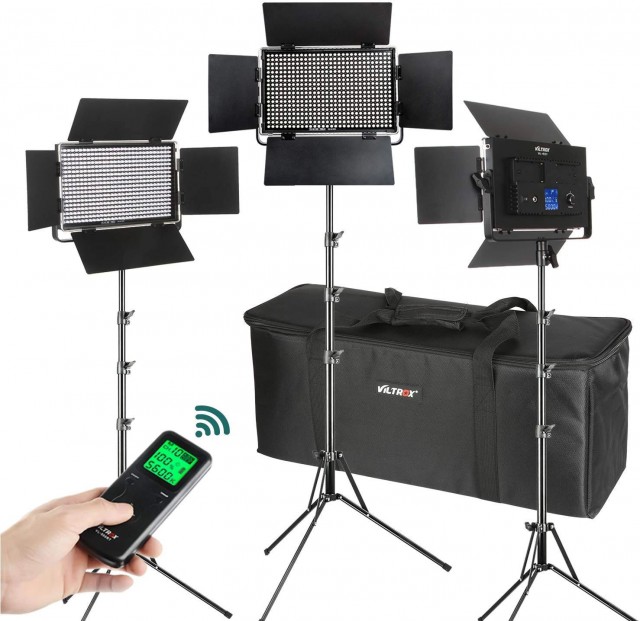 Set aus drei Viltrox VL-40T-Leuchten, intensives 40W Bi-color LED-Licht mit einstellbarer Farbtemperatur (im Bereich 3300-5600K) und Intensität (20-100%; max. 4400 lm, 2600 lx/1 m). Es bietet die Möglichkeit der drahtlosen Fernbedienung (2,4 GHz, Fernbedienung im Lieferumfang enthalten) und die Möglichkeit der Stromversorgung über Batterien (NP-F960 / F970, Batterie nicht im Lieferumfang enthalten) oder externes Netzteil (im Lieferumfang enthalten). Die Parametereinstellungen werden durch das leicht ablesbare LCD-Display erleichtert. Abmessungen 317x249x48 mm, Gewicht 1200 g.