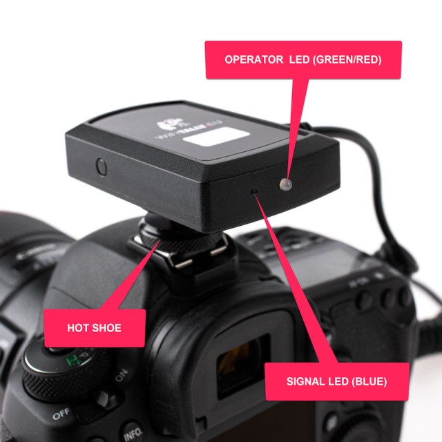 Das WiFi Tally light micro enthält zwei LED-Leuchten. Die eine ist blau und zeigt den Verbindungsstatus oder Signalverlust an. Die zweite LED informiert den Kameramann über den Status seiner Overhead-Aufnahme. Wenn die Haupt-LED grün leuchtet, wird die Aufnahme gerade für die Ausstrahlung vorbereitet, und wenn die LED rot leuchtet, wird die Aufnahme ausgestrahlt. Dies ist farblich an das übliche Design aller Video-Overheads Vorschau/Grün und Programm/Rot angepasst.