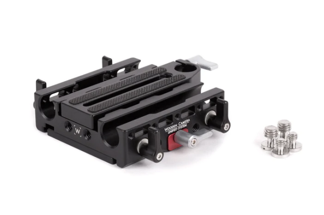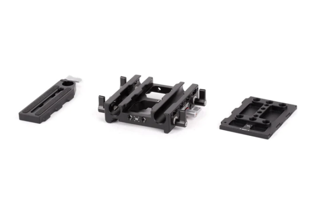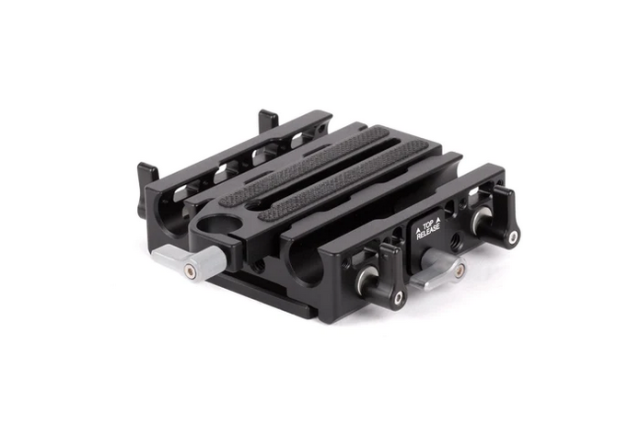 Die Unified Baseplate (Sony FX9, FS7, FS7mkII, Canon C100mkII, C300mkII, C100, C300, C500) ist eine Schnellwechselgrundplatte, die eine leichte 15-mm-Stangenhalterung in der richtigen Objektivhöhe bietet. die 15-mm-Stangen werden von vorne nach hinten durchgesteckt und sind mit zwei Rändelschrauben pro Seite gesichert. Die Grundplatte lässt sich auf zwei Arten schnell abnehmen, so dass der Benutzer die Möglichkeit hat, die leichten 15-mm-Stangen mitzunehmen oder sie zurückzulassen.