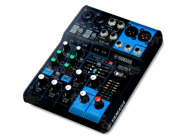 Das MG06X von Yamaha ist ein kompaktes Mischpult mit sechs Eingängen und integrierten Effekten für kleine Auftritte, Vorträge, Aufnahmen und ähnliche Anwendungen. Das Mischpult verfügt über zwei XLR-1/4"-Combo-Mikrofon/Line-Eingänge mit D-PRE-Mikrofonvorverstärkern sowie über zwei 1/4"-Stereo-Line-Eingänge mit Pegelstellern.