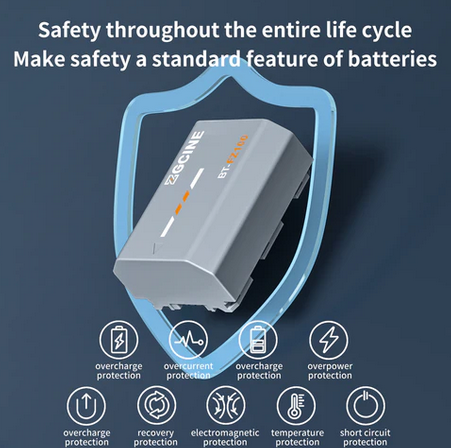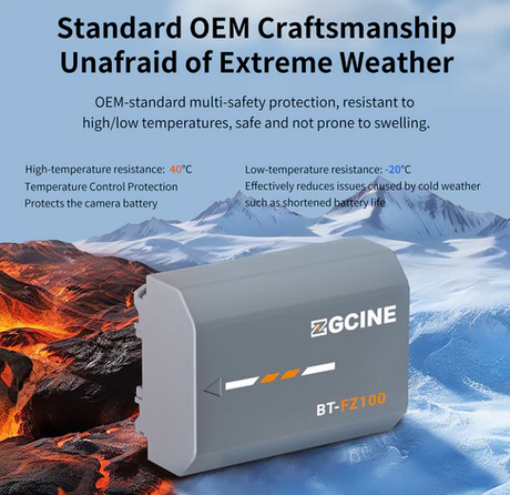 Der BT-FZ100 ist ein professioneller 2600-mAh-Lithium-Ionen-Ersatzakku, der speziell für das NP-FZ100-System von Sony entwickelt wurde. Da er vollständig decodiert ist, kommuniziert er perfekt mit dem Kameragehäuse, zeigt die genaue Restleistung an und ermöglicht das Laden in der Kamera ohne Warnungen oder Einschränkungen. Er besteht aus hochwertigen Li-Ionen-Zellen und verfügt über ein fortschrittliches 8-stufiges Schutzsystem (Überladung, Überstrom, Kurzschluss, Überhitzung usw.). Er liefert eine stabile Ausgangsspannung von 7,2 V und bietet erhöhte Sicherheit für längere Aufnahmesessions. In Kombination mit den Ladekoffern der ZGCINE PS-Serie oder den Ladegeräten der PC-Serie unterstützt er Schnellladen und erreicht in etwa 2,5 Stunden 100 % Kapazität – deutlich schneller als beim Standardladen mit Original-Ladegeräten von Sony.