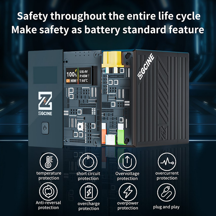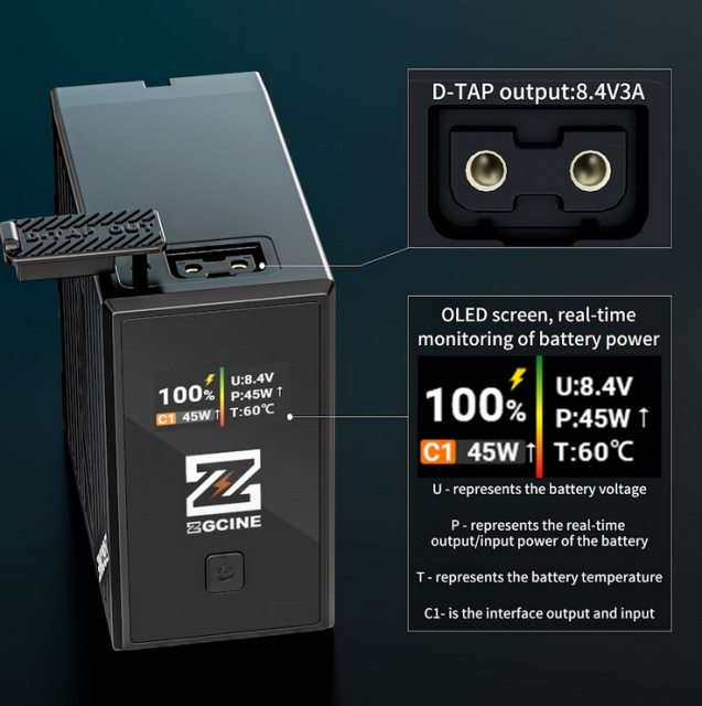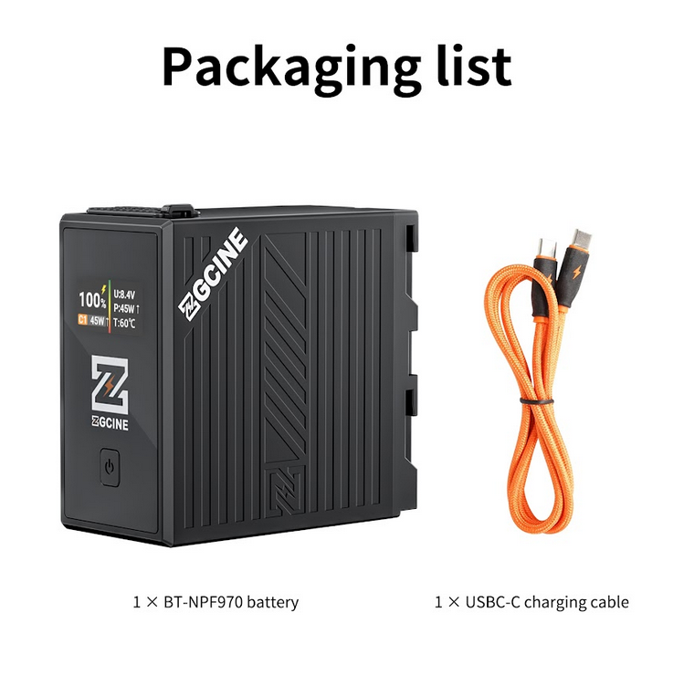 Der Akku ZGCINE BT-NPF970 der L-Serie bietet hohe Leistung in einer robusten, kompakten Form mit einer Lithium-Ionen-Kapazität von 9600 mAh (7,2 V/69,12 Wh) und unterstützt PD-Schnellladung und -Entladung mit bis zu 36 W über USB-C. Ausgestattet mit einem D-TAP-Ausgang (8,4 V/3 A), einem NPF-Ausgang (7,2 V/10 A) und einem NPF-Eingang (8,4 V/6 A) versorgt sie eine Vielzahl von Kino- und Rundfunkgeräten mit Strom. Der integrierte OLED-Bildschirm ermöglicht die Echtzeitüberwachung des Batteriestands, der Spannung (U), der Leistung (P), der Temperatur (T) und des C1-Schnittstellenstatus. Mit einer einzigen Taste kann die Anzeige umgeschaltet werden (während des Ladevorgangs inaktiv). Das Gerät wurde für Sicherheit während seiner gesamten Lebensdauer entwickelt und verfügt über Schutzvorrichtungen gegen Überhitzung, Kurzschluss, Überspannung, Überstrom, Verpolung, Überladung und Überlastung. Es besteht aus PC+ABS, arbeitet zuverlässig bei Temperaturen von -10 °C bis 45 °C und verfügt über Plug-and-Play-Funktionalität für die nahtlose Integration in professionelle Arbeitsabläufe.