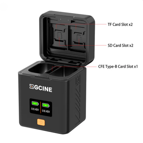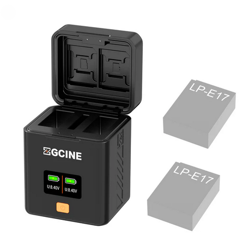 Das ZGCINE Ladecase ist ein multifunktionales Zubehör für Canon LP-E17-Akkus. Es unterstützt USB-C-PD-Schnellladen und verfügt über spezielle Steckplätze für zwei SD-, zwei TF- und eine CFE-Speicherkarte vom Typ B. Mit einem 0,96-Zoll-OLED-Bildschirm ist dieses kompakte Case eine All-in-One-Lösung zum Laden und Organisieren Ihrer Ausrüstung.