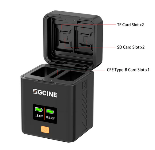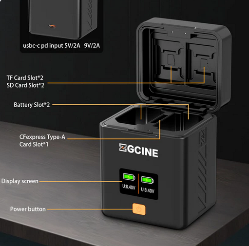 Das ZGCINE Charging Case für den Fujifilm NP-W126S Akku ist ein kompaktes, multifunktionales Gehäuse, das den USB-C PD-Eingang/Ausgang unterstützt und über spezielle Steckplätze für SD-, TF- und CFE-Type-B-Karten sowie einen OLED-Bildschirm zur Statusanzeige verfügt.