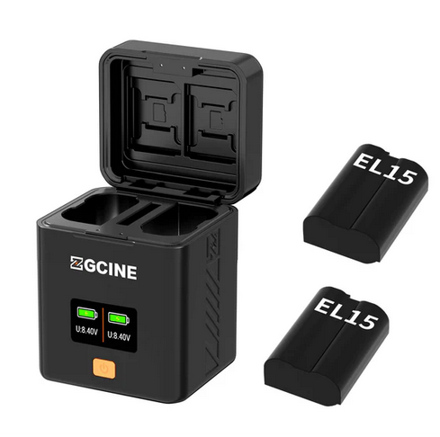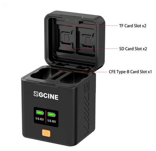Das ZGCINE-Ladeetui für Nikon EN-EL15c-Akkus ist eine vielseitige Ladelösung mit USB-C-PD-Eingang/-Ausgang, mehreren Kartensteckplätzen und einem 0,96-Zoll-OLED-Bildschirm für die Echtzeitüberwachung.