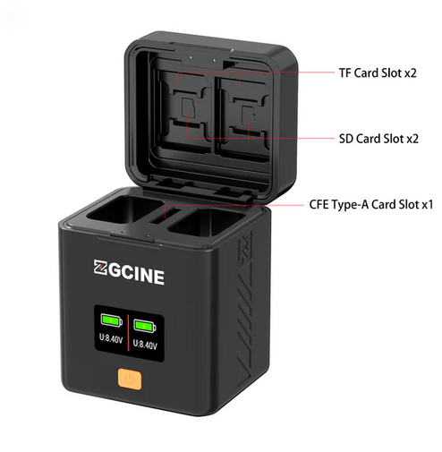 Das ZGCINE Charging Case for SONY NP-FW50 Battery ist eine kompakte und effiziente Ladelösung mit USB-C PD-Eingang, mehreren Speicherkartensteckplätzen und einem 0,96-Zoll-OLED-Bildschirm zur Echtzeit-Statusüberwachung.