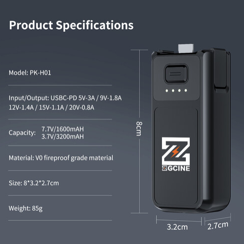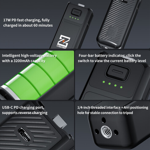 Der ZGCINE PK-H01 Batteriegriff ist ein leistungsstarkes Zubehör für DJI Osmo Pocket 3-Kameras und bietet einen intelligenten Hochspannungsakku mit einer Kapazität von 3200 mAh für sorgenfreies Filmen. Dank seines kompakten und leichten Designs lässt er sich leicht transportieren, während die 17-W-PD-Schnellladefunktion eine vollständige Aufladung des Batteriegriffs in etwa 60 Minuten ermöglicht. Der Griff unterstützt das Laden bei niedrigen Temperaturen mit minimalen elektrischen Störungen, das Rückwärtsladen über USB-C PD und verfügt über eine vierstufige Akkuanzeige zur Echtzeitüberwachung. Mit einer 1/4-Zoll-Gewindeanschluss und einer Arri-Positionierungsbohrung gewährleistet er eine stabile Verbindung zu Stativen. Darüber hinaus ermöglicht er die direkte Datenübertragung auf Computer, um bequem auf Speicherkartendateien zuzugreifen.