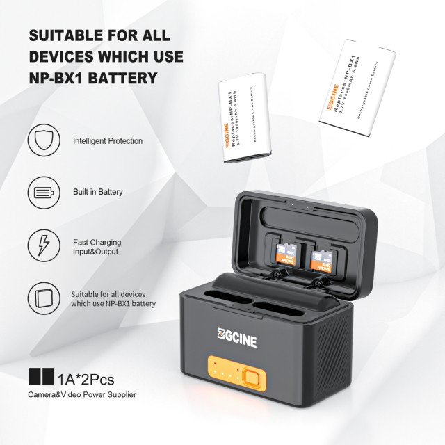 Das ZGCINE Sony BX1 Battery Charging Case ist ein tragbares Dual-Slot-Ladegerät mit einem eingebauten 5600mAh-Akku für schnelles Aufladen und bequeme Lagerung von NP-BX1-Akkus. Unterstützt USB-C PD 20W Input/Output für eine effiziente Energieversorgung.