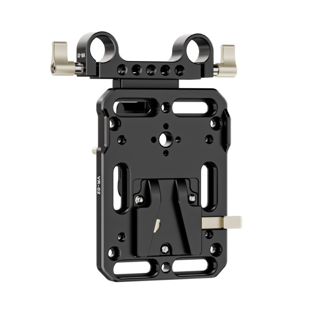 Die ZGCINE V-Lock-Platte mit verstellbarem Arm ist eine vielseitige Akkumontagelösung mit einem V-Mount-Schnellwechselsystem, einer verstellbaren 15-mm-Stabklemme und mehreren Montagepunkten für die nahtlose Integration mit professionellen Kamera-Rigs und Zubehör.