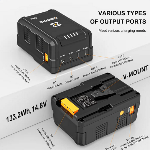 Der ZGCINE V-Mount-Akku 16,8V 150Wh wurde für eine leistungsstarke Stromversorgung entwickelt und eignet sich daher perfekt für Kinokameras, LED-Leuchten und Filmzubehör. Mit zwei unabhängigen USB-C-PD-Anschlüssen, zwei D-Tap-Ausgängen und zwei Gleichstromausgängen liefert dieser Akku vielseitige und stabile Energie für mehrere Geräte gleichzeitig.