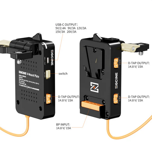 Die VM-VP5 ist eine spezielle V-Mount-Platte, die eine robuste und vielseitige Stromversorgungslösung für die Sony FX6 und andere kompatible Kameras bietet. Das herausragendste Merkmal ist die geregelte 19,5-V-Ausgabe, die speziell auf den Strombedarf der Sony FX6 abgestimmt ist und eine stabile und zuverlässige Leistung gewährleistet. Diese Platte unterstützt den Hot-Swap-Austausch des integrierten BPU-Akkus, sodass Sie V-Mount-Akkus wechseln können, ohne die Stromversorgung der Kamera zu unterbrechen, was bei langen Dreharbeiten von entscheidender Bedeutung ist. Zur Stromversorgung mehrerer Zubehörteile verfügt die VM-VP5 über eine Vielzahl von Ausgangsanschlüssen: einen USB-C-PD-Anschluss (mit einer Stromversorgung von bis zu 20 V/3 A) für moderne Geräte, drei D-Tap-Ausgänge (14,8 V/15 A) und einen BPU-Ausgang (14,8 V/10 A) für kompatible Kameras. Die Platte verfügt über eine einfache Ein-Tasten-Steuerung für eine einfache Bedienung. Das Paket enthält die VP5-Platte und zwei 1/4"-Schrauben sowie das erforderliche 19,5-V-Stromkabel für die Sony FX6.