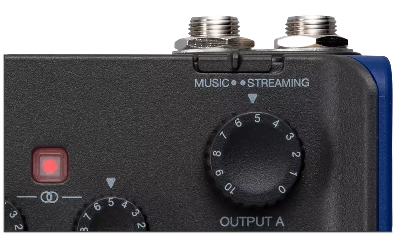 Mit dem Music/Streaming-Schalter können Sie ganz einfach zwischen Aufnahme- und Streaming-Modus umschalten. Im Musikmodus können Sie jeden Eingang einzeln mit einem eigenen Gain-Regler steuern. Außerdem können Sie an jeden Kopfhörerausgang einen anderen Mix senden.