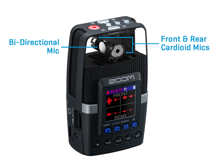 Mit zwei Nierenmikrofonen, die nach vorne und hinten gerichtet sind, und einem bidirektionalen Mikrofon, das zur Seite gerichtet ist, ermöglicht das H2essential die Auswahl des perfekten Aufnahmemusters für jede Aufnahme.